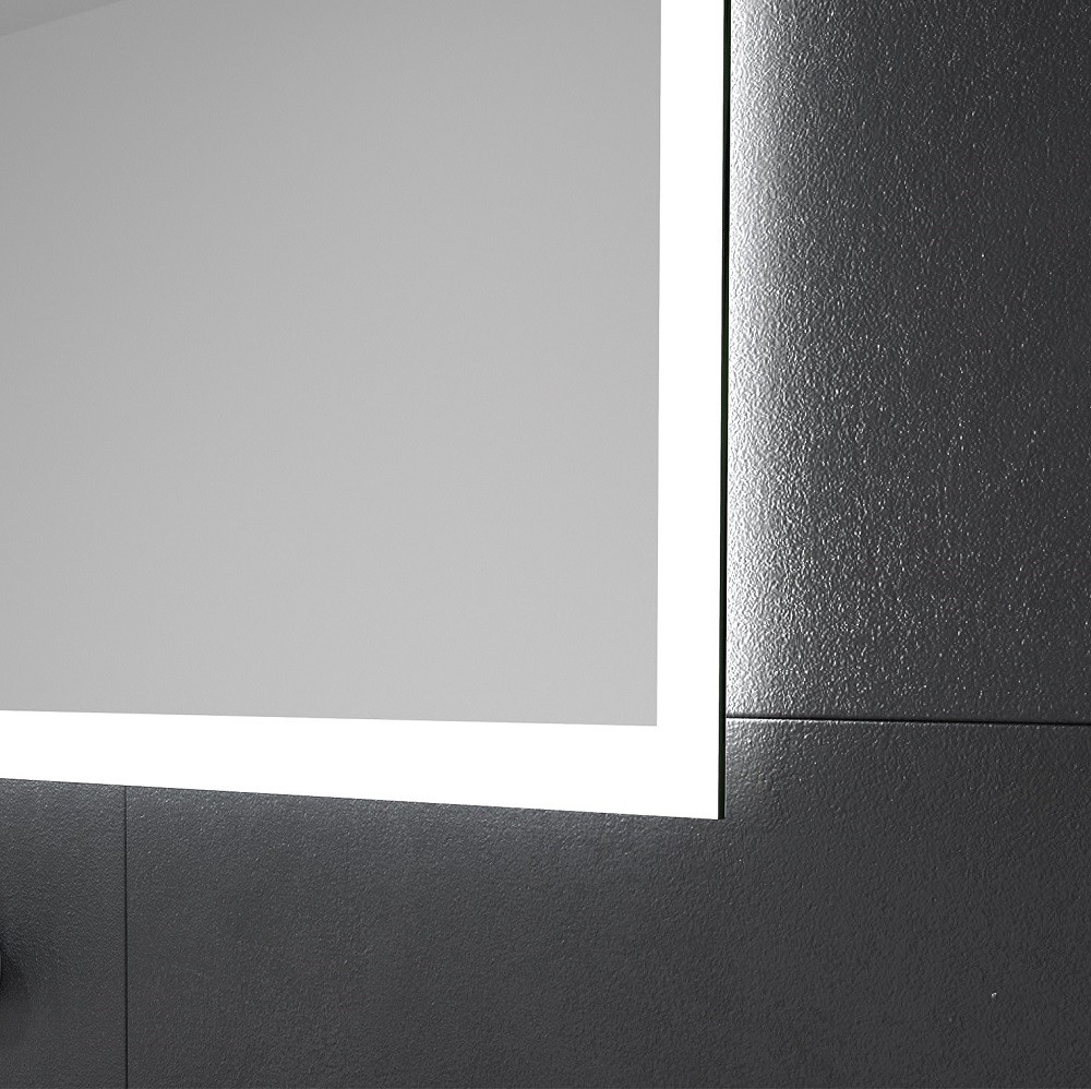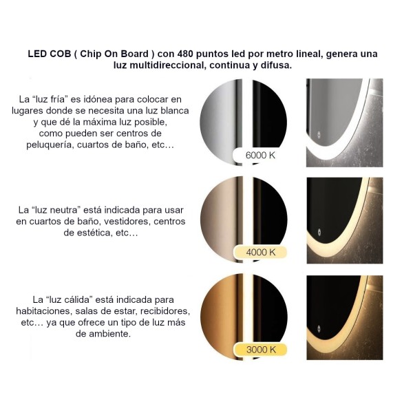 El espejo cuenta con iluminación ambiental indirecta perimetral (luz mural) y otra directa emitida por la parte frontal (vidrio arenado).