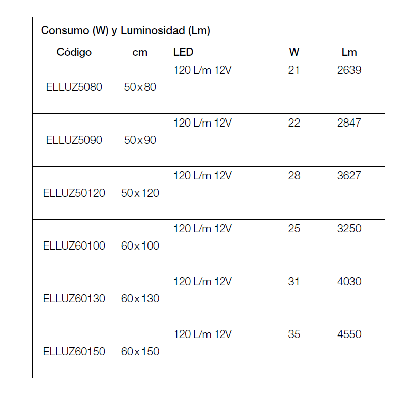- Colores de iluminación a elegir: Luz fría: 6.000ºK, Luz neutra: 4.000ºK, Luz cálida: 3.000ºK.