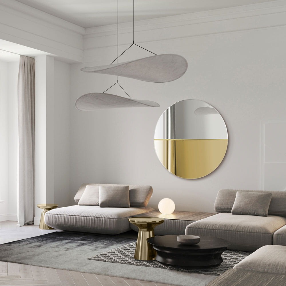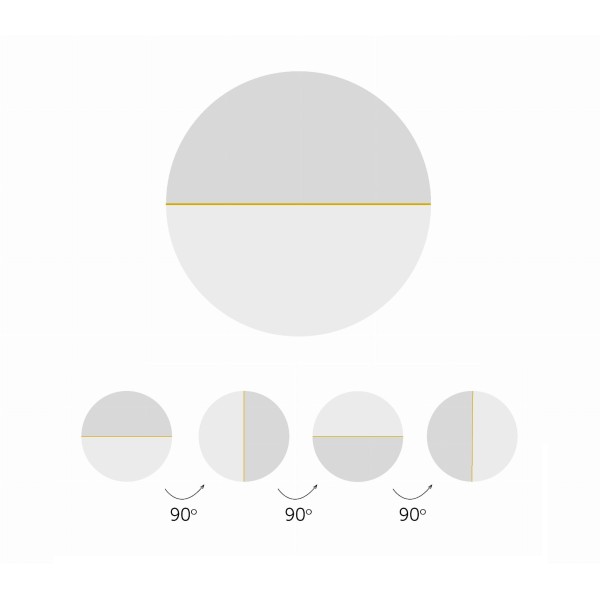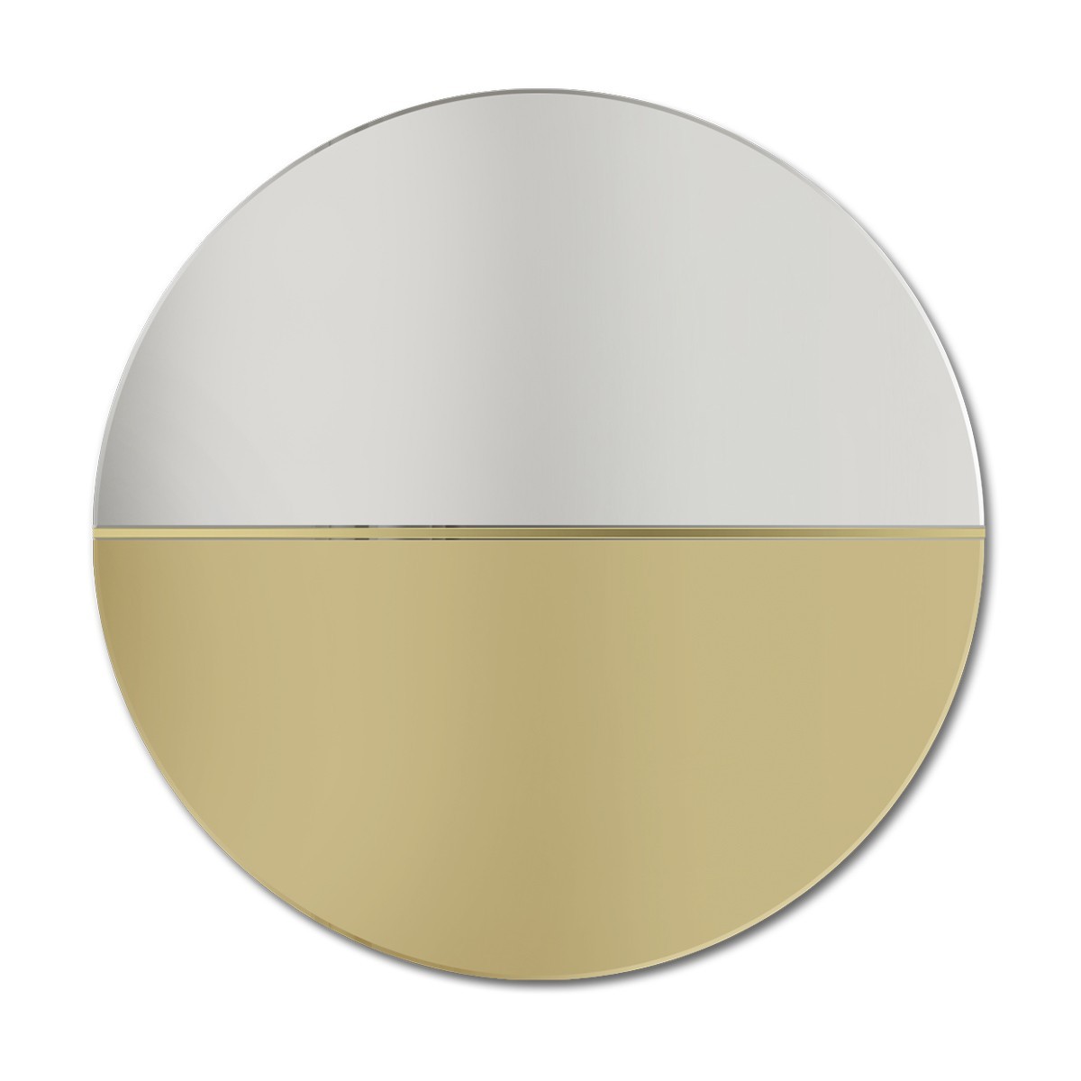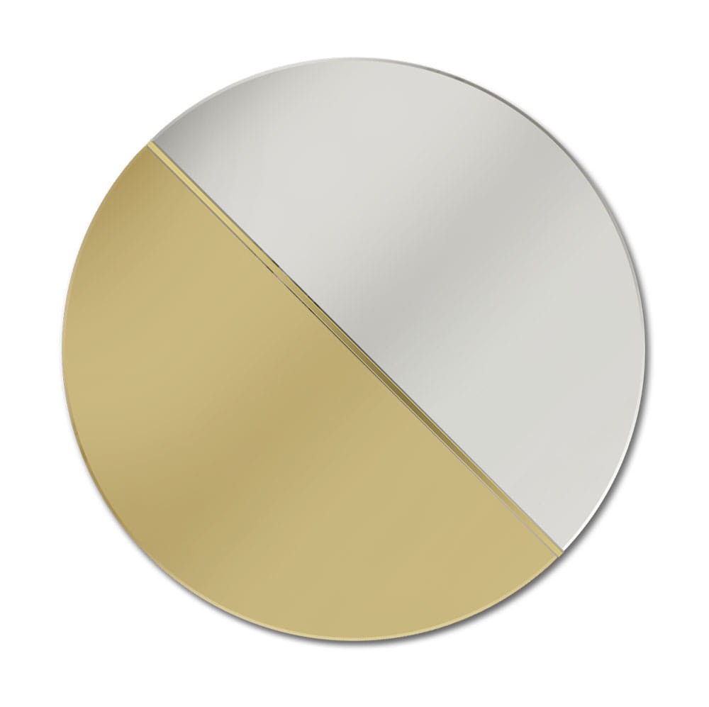 Espejo redondo decorativo Demi Gold. Su diseño, es el resultado de una fusión de colores, texturas y formas. El espejo está compuesto por tres elementos; espejo plateado, espejo color oro dorado y una estrecha tira de latón pulido, que agrega al conjunto nobleza y elegancia.