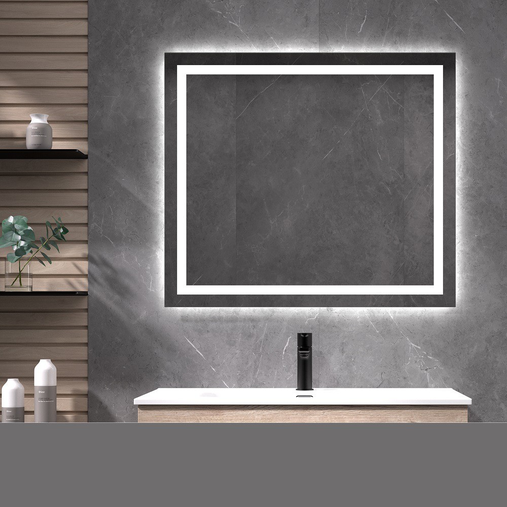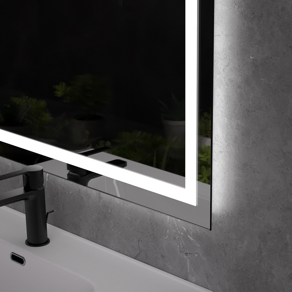 El espejo cuenta con iluminación ambiental indirecta perimetral (luz mural) y otra directa emitida por la parte frontal (vidrio arenado).