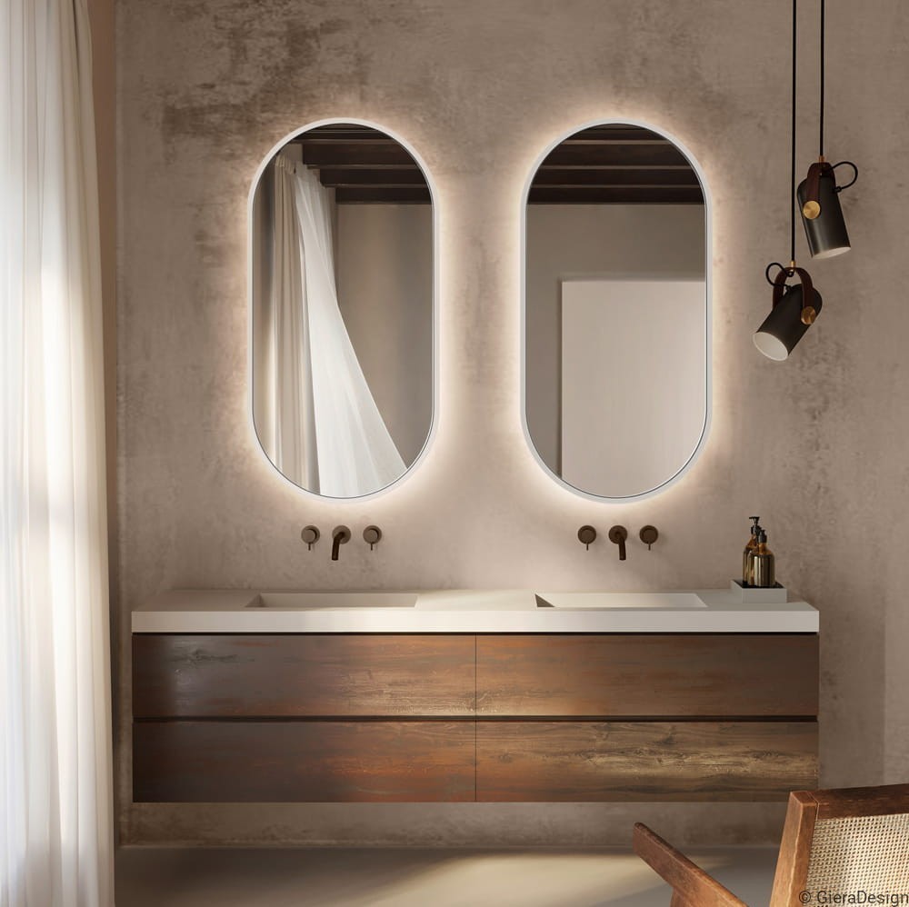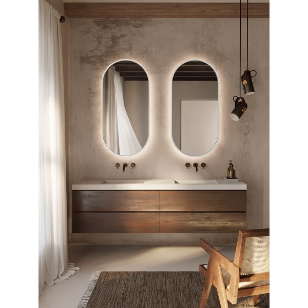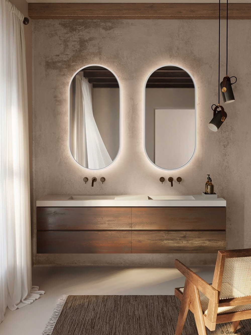Espejo ovalado retroiluminado con diseño minimalista y elegante, ideal para baños de estilo cálido y contemporáneo. Su marco blanco fino y luz LED perimetral aportan suavidad, luminosidad y armonía al ambiente. Perfecto para espacios con texturas naturales y tonos tierra, este espejo decorativo combina funcionalidad y estética refinada. Ideal para proyectos de interiorismo que buscan equilibrio entre modernidad y calidez. Espejo de baño ovalado con luz integrada, perfecto para crear atmósferas serenas y sofisticadas con un toque de diseño actual.