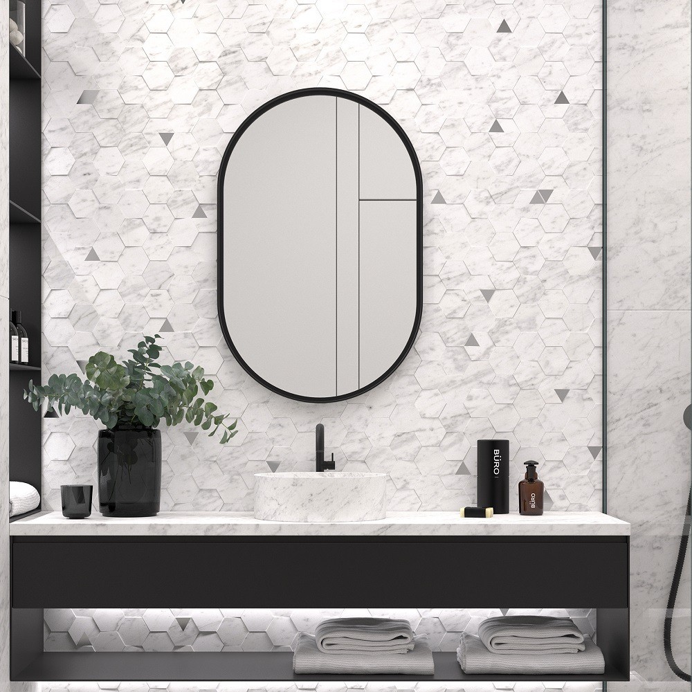 Este espejo ovalado sin luz con marco metálico negro destaca por su diseño limpio, elegante y contemporáneo. Su estructura fina en acabado negro mate aporta un toque sofisticado, ideal para baños de estilo moderno, industrial o nórdico. La forma ovalada suaviza el espacio y aporta verticalidad visual, mientras que el marco metálico garantiza durabilidad y resistencia. Perfecto para quienes buscan un espejo decorativo moderno que combine funcionalidad y estética refinada. Se integra fácilmente en interiores de diseño gracias a su versatilidad y carácter atemporal.