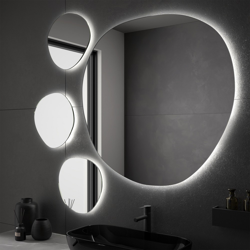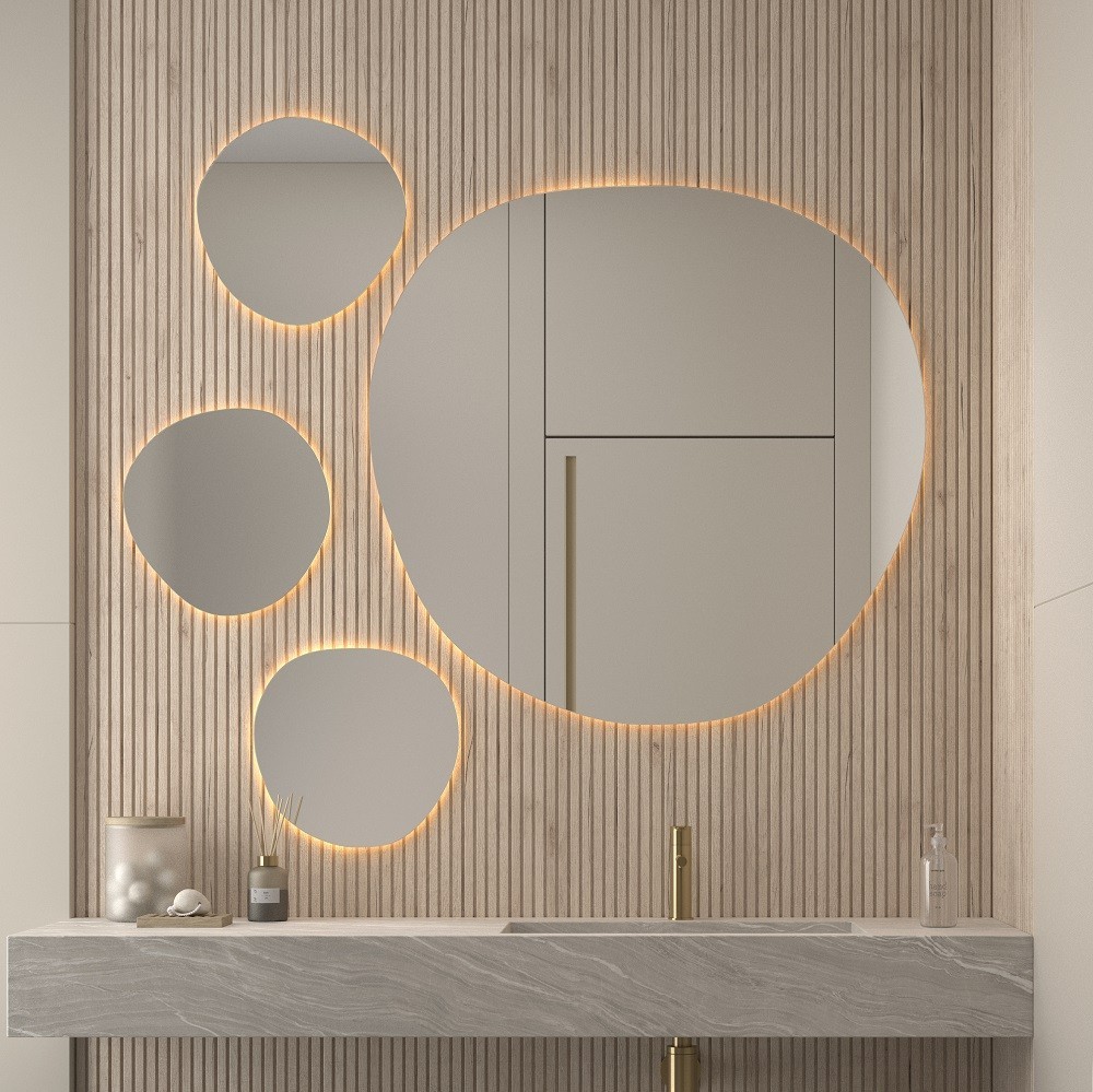 Espejo asimétrico con retroiluminación LED integrada. Este bello espejo destaca por su diseño actual orgánico siendo al mismo tiempo funcional y práctico. Incorpora lo último en tecnología, ademas iluminación led de bajo consumo disponible en diferentes colores a elegir.
