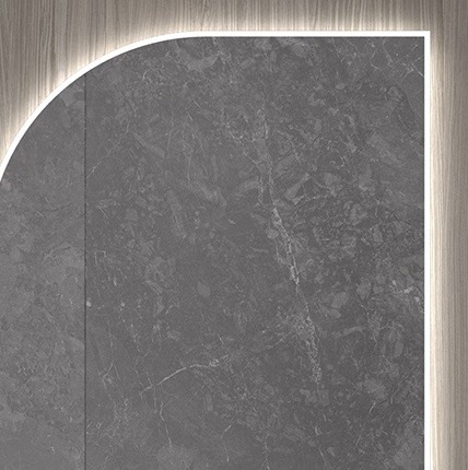 El espejo cuenta con iluminación ambiental indirecta perimetral (luz mural) y otra directa emitida por la parte frontal (vidrio arenado).