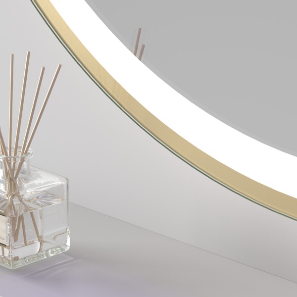 El espejo cuenta con iluminación ambiental indirecta perimetral (luz mural) y otra directa emitida por la parte frontal (vidrio arenado).