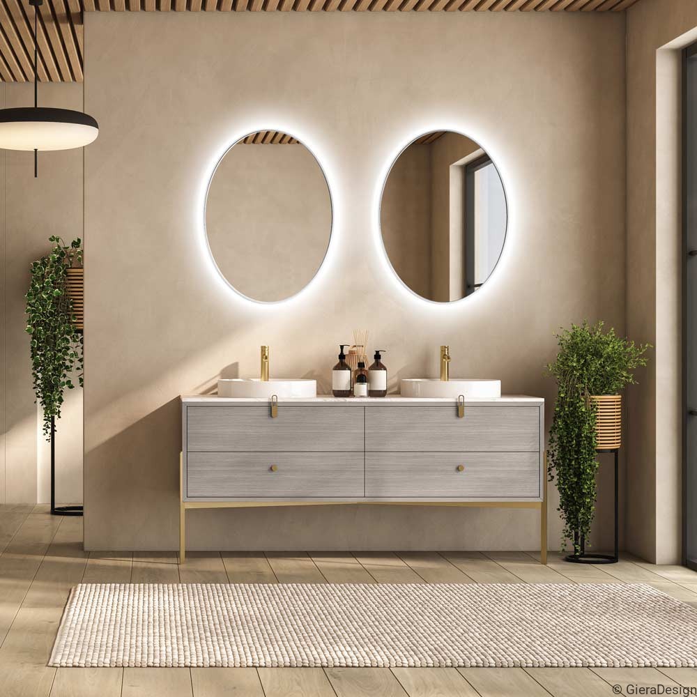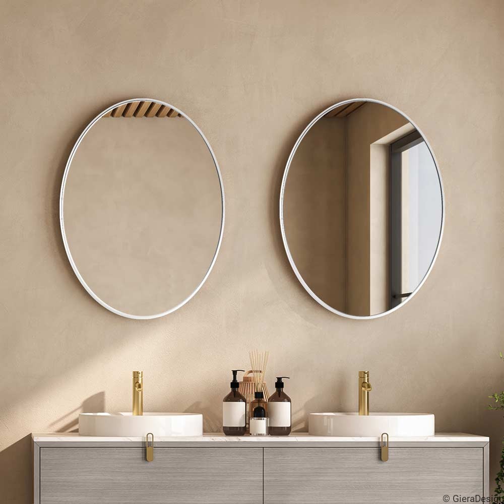 Espejo ovalado con marco blanco y retroiluminación LED, ideal para baños de estilo moderno, escandinavo o minimalista. Su forma alargada suaviza el espacio y aporta elegancia, mientras la luz perimetral crea una atmósfera cálida y funcional. El marco blanco se integra con naturalidad en ambientes claros, aportando frescura y luminosidad. Perfecto para combinar con madera clara y grifería dorada. Espejo decorativo de baño con diseño limpio, luz LED integrada y estética contemporánea, ideal para interiores relajantes y bien equilibrados.
