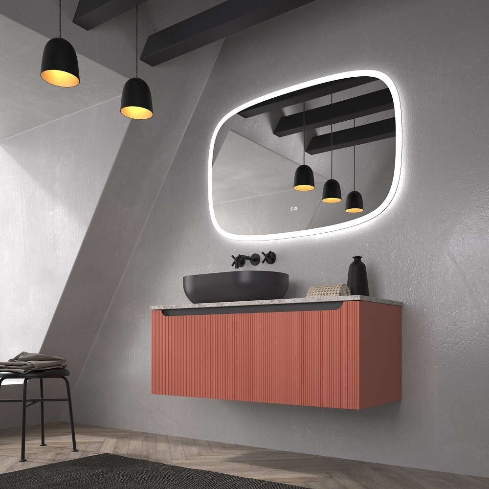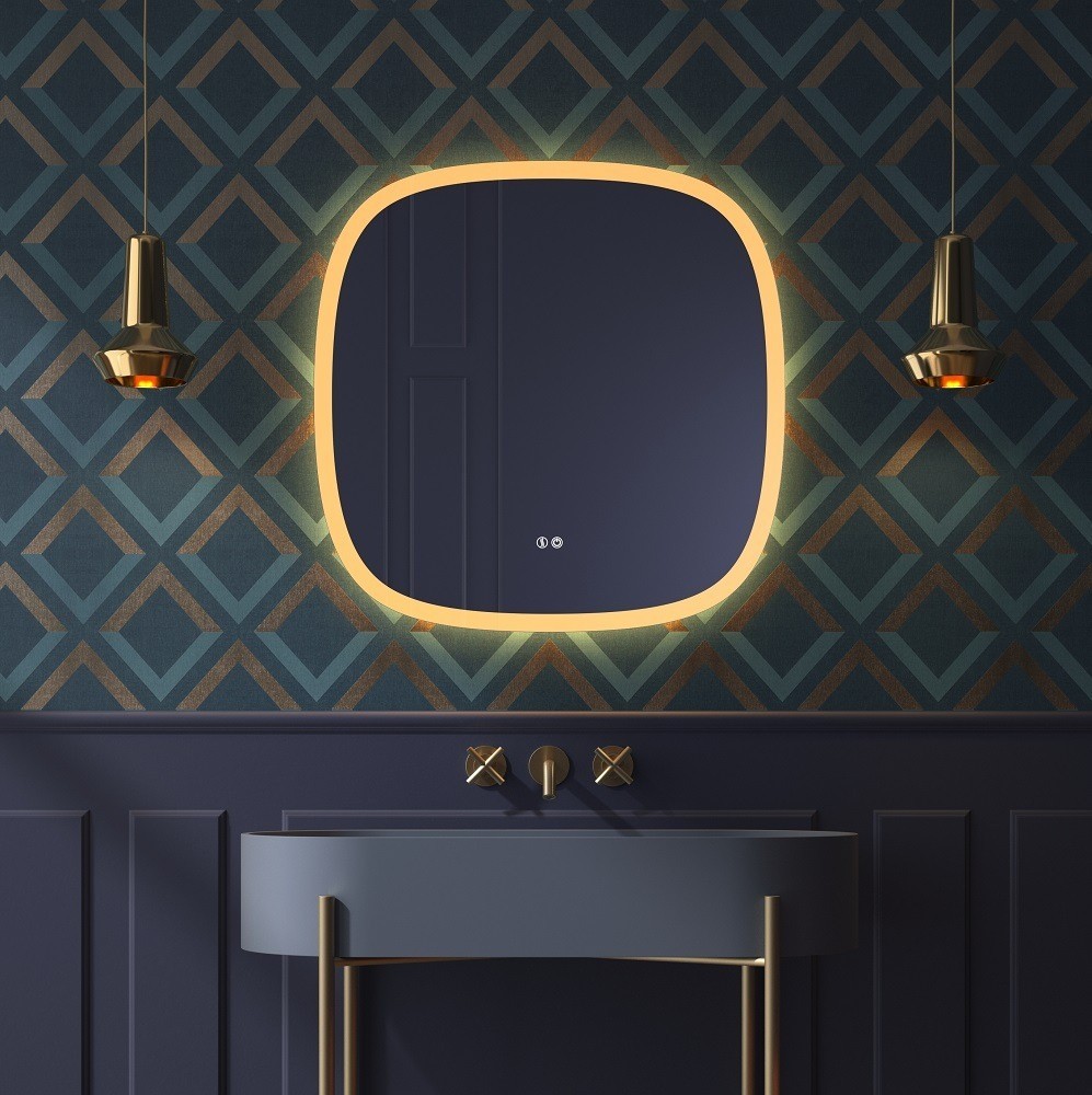 El espejo cuenta con iluminación ambiental indirecta perimetral (luz mural) y otra directa emitida por la parte frontal (vidrio arenado).