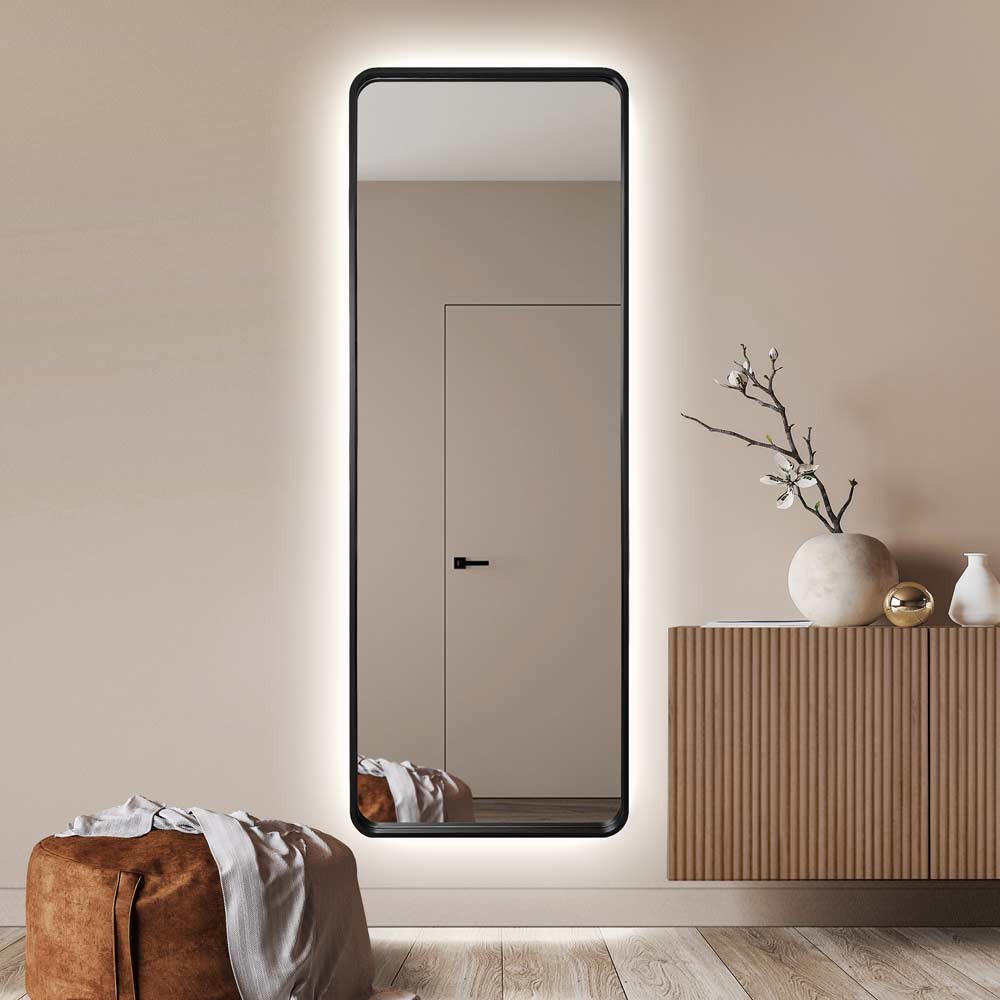 Espejo rectangular grande de cuerpo entero con esquinas redondeadas, marco negro y retroiluminación LED, ideal para dormitorios, vestidores, recibidores o zonas de paso con estilo moderno. Su diseño vertical estiliza visualmente el espacio y permite una vista completa, mientras la luz LED perimetral proporciona una iluminación suave y decorativa. Perfecto para ambientes minimalistas, escandinavos o contemporáneos. Espejo decorativo con luz integrada y marco negro, funcional y estético, pensado para interiores que combinan elegancia, practicidad y diseño limpio.