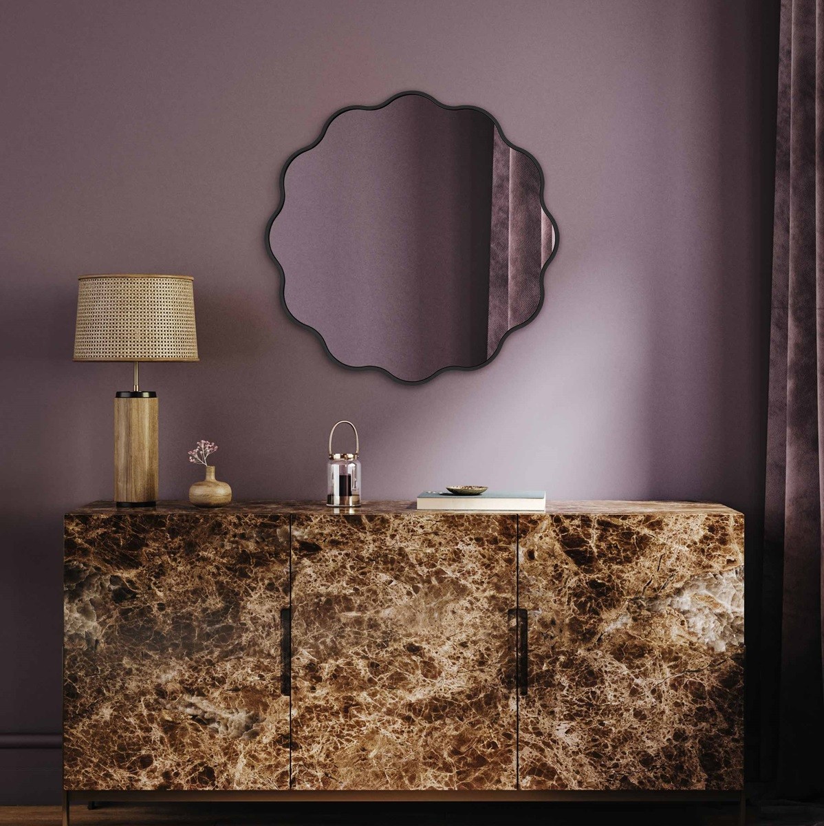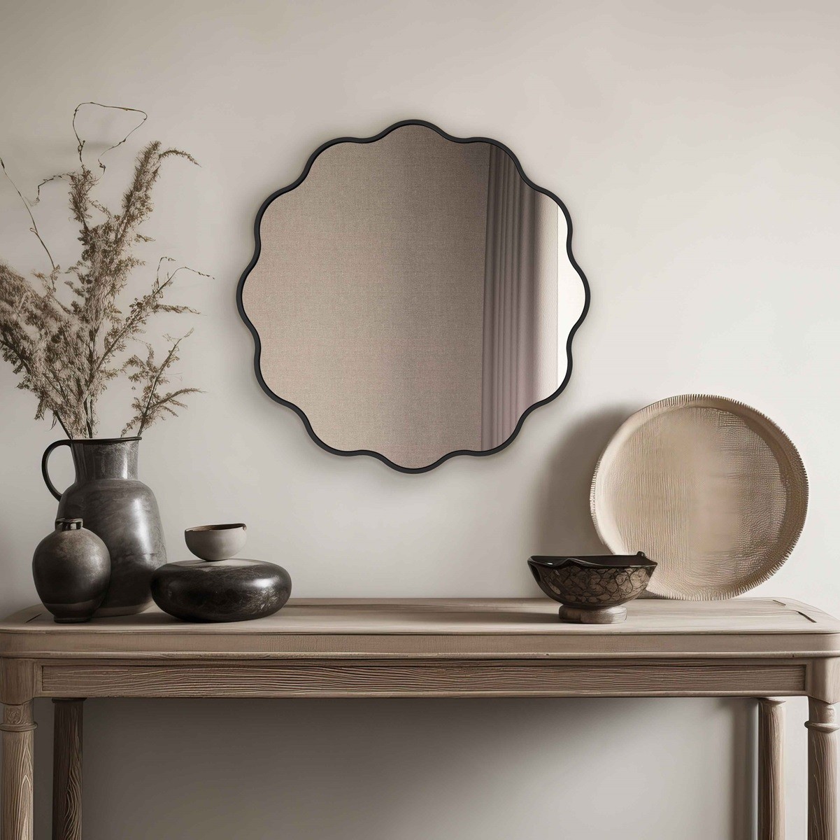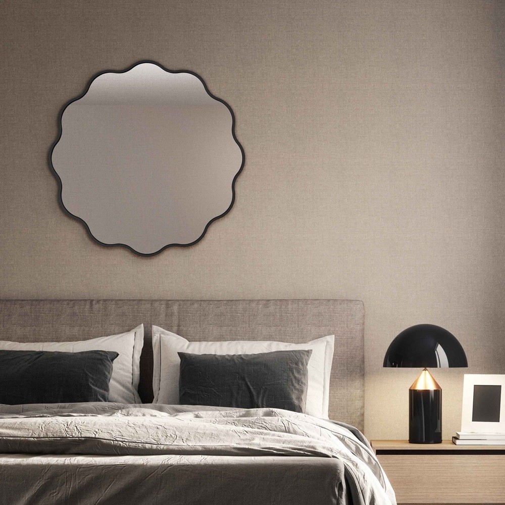 Este espejo redondo con marco ondulado en negro es una pieza decorativa elegante y original que aporta carácter a cualquier estancia. Su borde en forma de ondas rompe con el diseño clásico del espejo circular, creando un efecto sofisticado y lleno de dinamismo. El marco fino en negro mate realza su contorno y lo convierte en un complemento versátil, ideal para interiores modernos, nórdicos o contemporáneos. Fabricado con materiales de alta calidad, ofrece un reflejo claro y duradero. Un espejo exclusivo, perfecto para salones, dormitorios o recibidores.