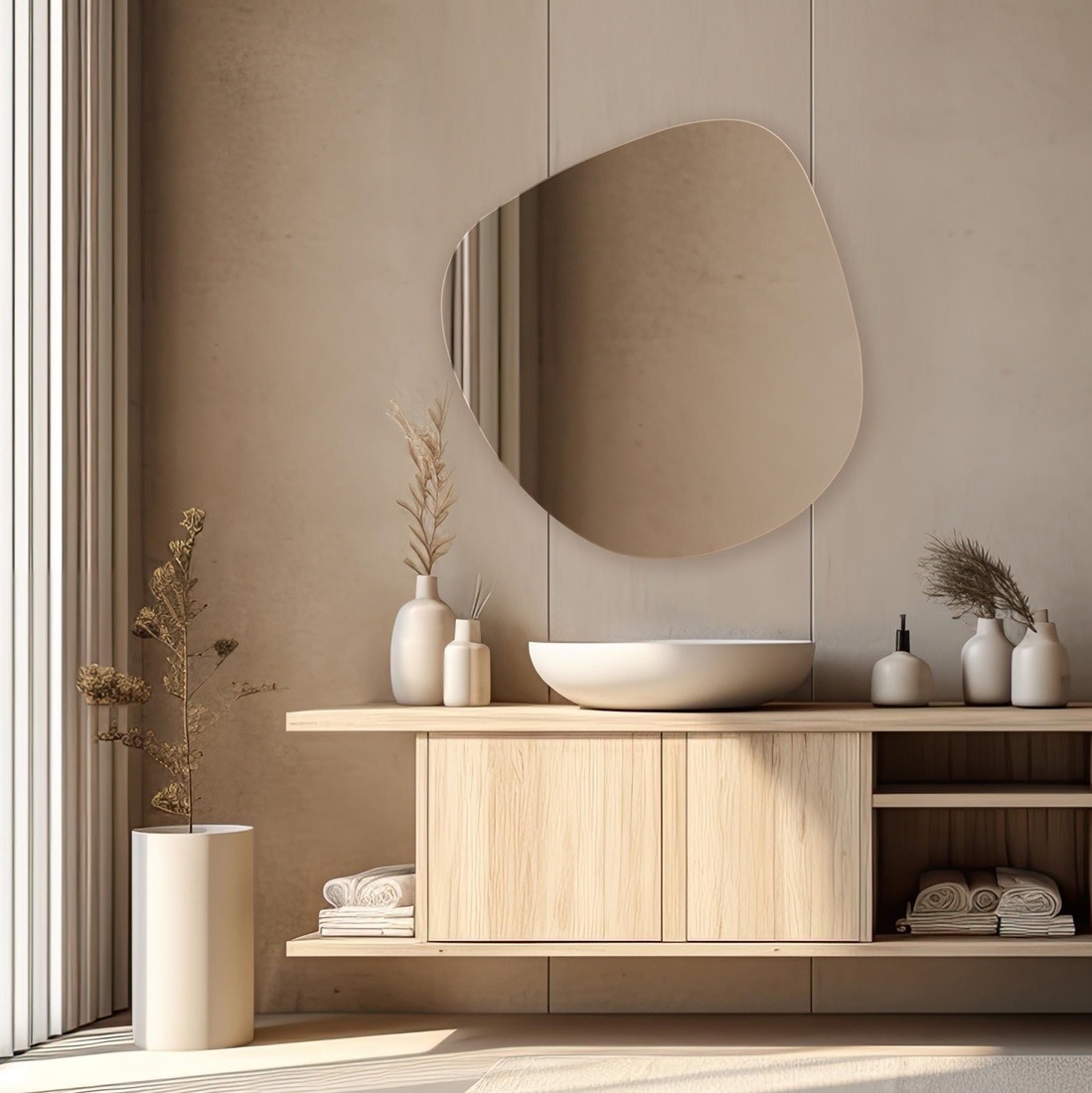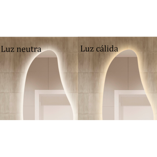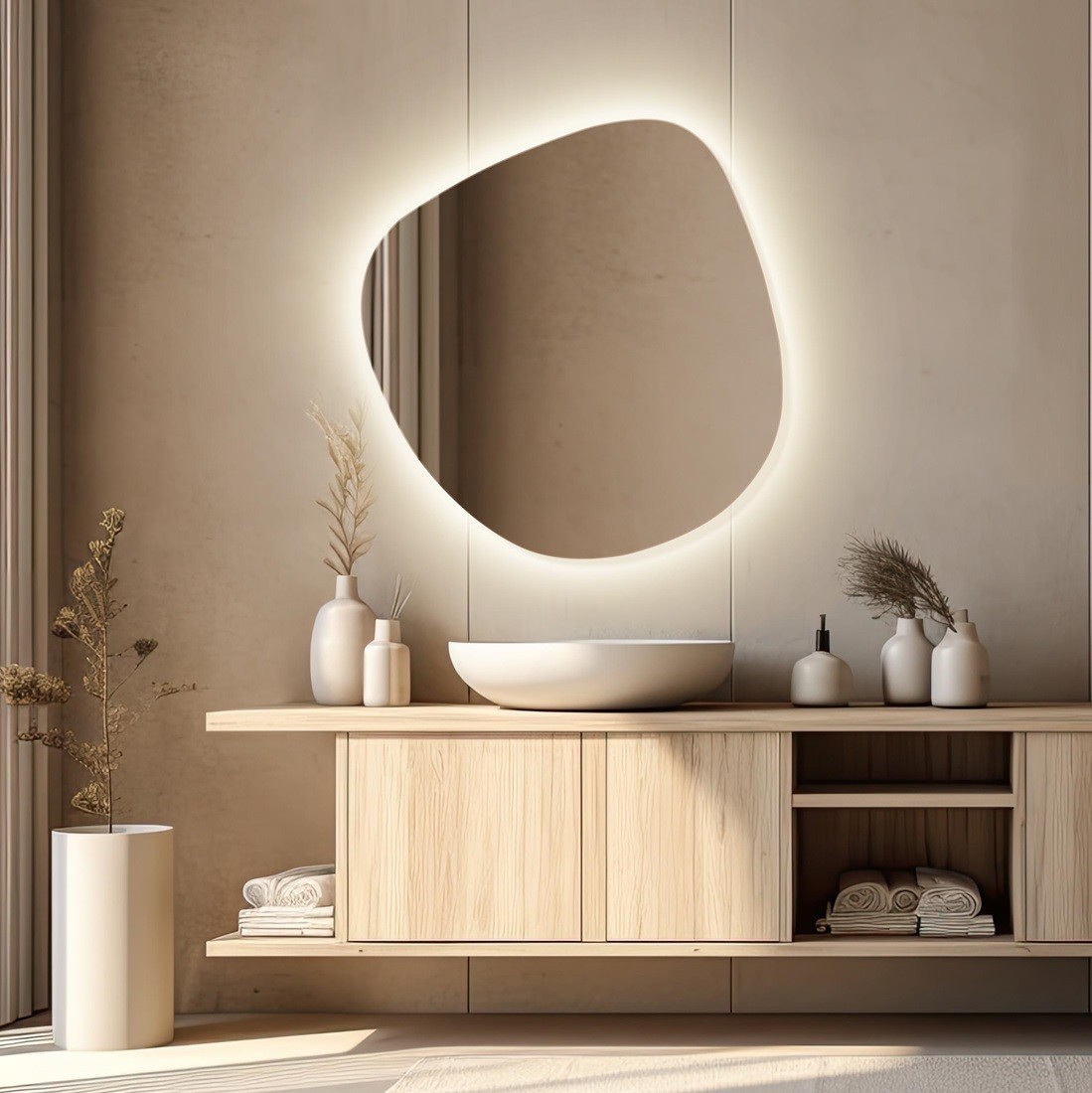 Este espejo irregular con retroiluminación LED transforma el baño en un espacio elegante y contemporáneo. Su silueta orgánica y asimétrica aporta dinamismo, mientras que la iluminación perimetral LED crea un halo cálido y envolvente que realza la decoración y proporciona una luz suave y funcional. Ideal para baños modernos o minimalistas, aporta amplitud y luminosidad, convirtiéndose en un elemento práctico y decorativo a la vez. Fabricado con materiales de alta calidad, garantiza un reflejo nítido y duradero. Un espejo exclusivo que une diseño, tecnología y estilo.