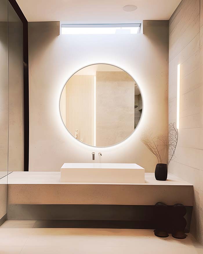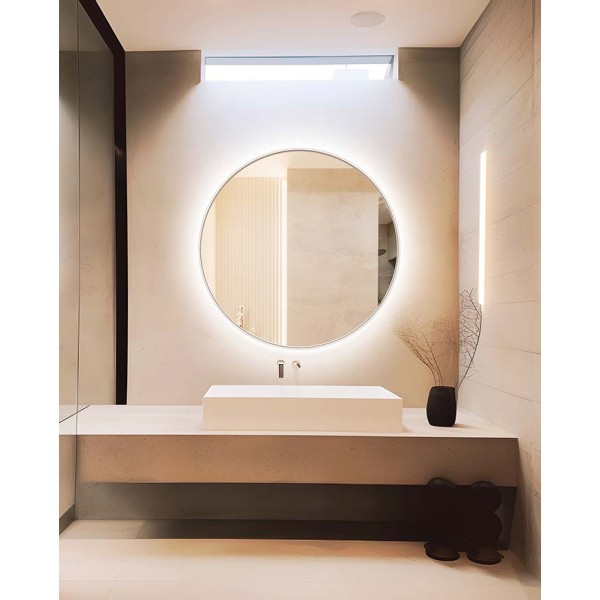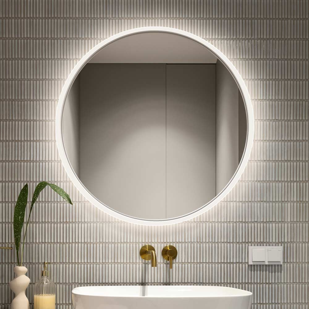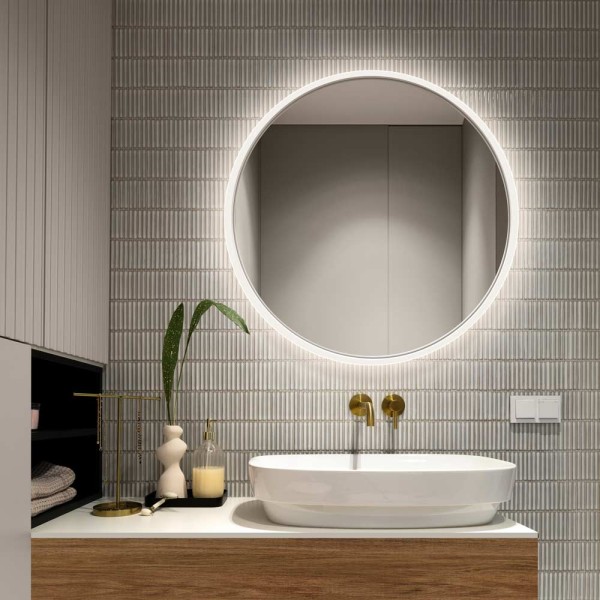 Espejo redondo con marco blanco y retroiluminación LED, perfecto para baños luminosos y elegantes. Su diseño simétrico aporta armonía visual, mientras la luz perimetral suaviza el ambiente y mejora la funcionalidad diaria. El marco blanco realza la claridad del espacio, ideal para paredes en tonos neutros o decoraciones clásicas. Este espejo decorativo combina minimalismo y sofisticación, adaptándose a interiores contemporáneos o atemporales. Espejo de baño redondo con luz integrada y marco blanco, ideal para proyectos de interiorismo frescos y serenos.