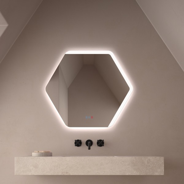 El espejo hexagonal retroiluminado es una pieza moderna ideal para baños de diseño. Su forma geométrica única añade carácter y estilo, mientras la luz LED cálida integrada resalta su contorno, creando una atmósfera elegante y funcional. Equipado con tecnología antivaho y control táctil, este espejo ofrece confort y eficiencia. Perfecto para quienes buscan un espejo de baño decorativo que combine estética y tecnología. Mejora la experiencia diaria con este espejo con luz integrada, una opción sofisticada para interiores contemporáneos. Ideal para destacar en proyectos de interiorismo moderno.
