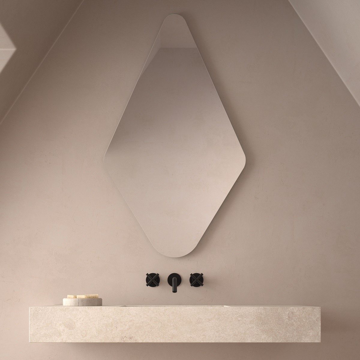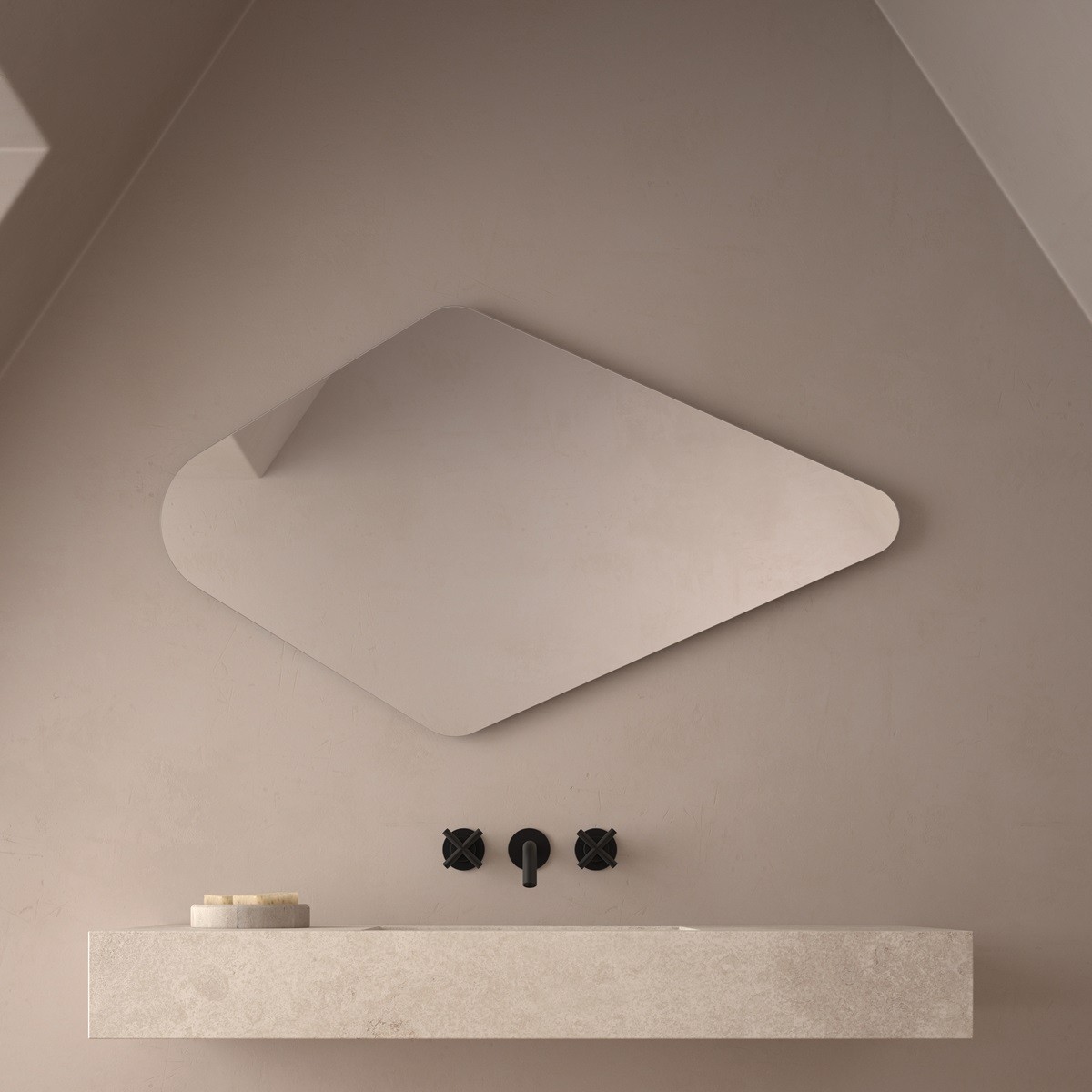 Este espejo en forma de rombo orgánico destaca por su diseño minimalista y escultórico, ideal para baños modernos o espacios de autor. Su geometría alargada rompe con las formas tradicionales y se adapta perfectamente a lavabos estrechos o paredes anguladas, como en buhardillas. Es una pieza decorativa en sí misma, sin iluminación integrada, que apuesta por la pureza formal y la elegancia silenciosa.