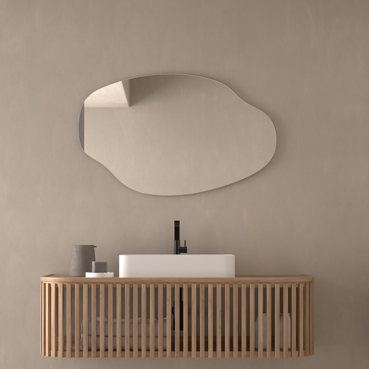 Este espejo asimétrico sin luz con forma fluida y horizontal es ideal para añadir un toque original y moderno al baño. Su silueta orgánica, inspirada en la naturaleza, rompe con las formas tradicionales y aporta ligereza visual al espacio. Perfecto como espejo decorativo para baños contemporáneos, se adapta a estilos escandinavos, bohemios o minimalistas, convirtiéndose en un punto focal sutil pero distintivo.