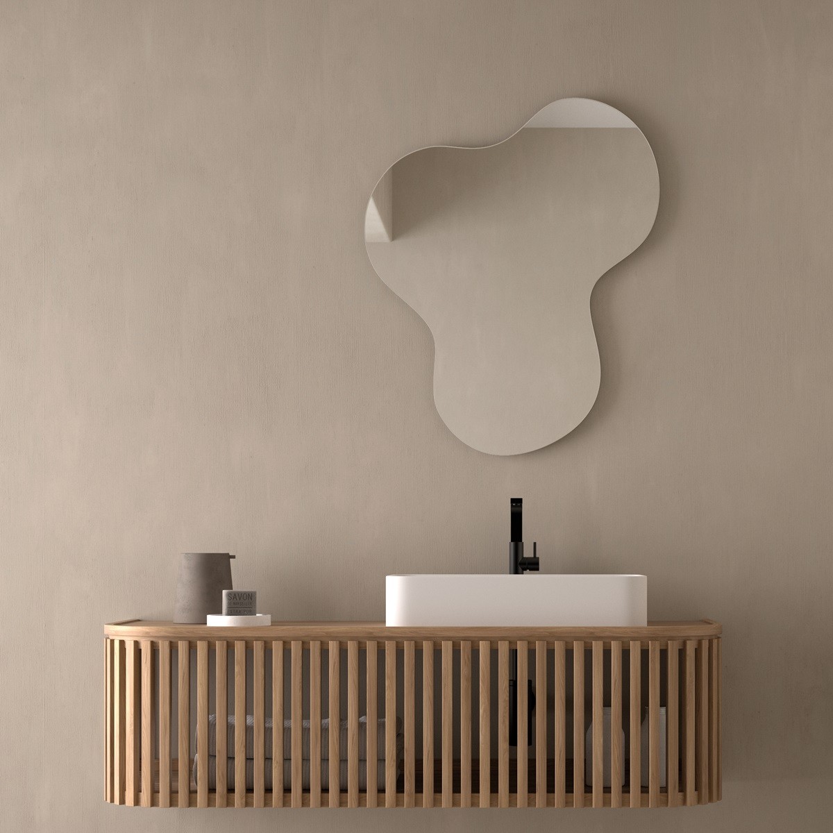 Este espejo asimétrico sin luz y sin marco es una pieza decorativa audaz que transforma cualquier baño en un espacio con carácter. Su forma libre e inspirada en la naturaleza rompe con la simetría convencional, aportando suavidad visual y un aire artístico. Ideal como espejo de diseño orgánico para baños contemporáneos, combina perfectamente con estilos escandinavos, japandi o boho. Una propuesta creativa para quienes buscan originalidad sin renunciar a la elegancia.