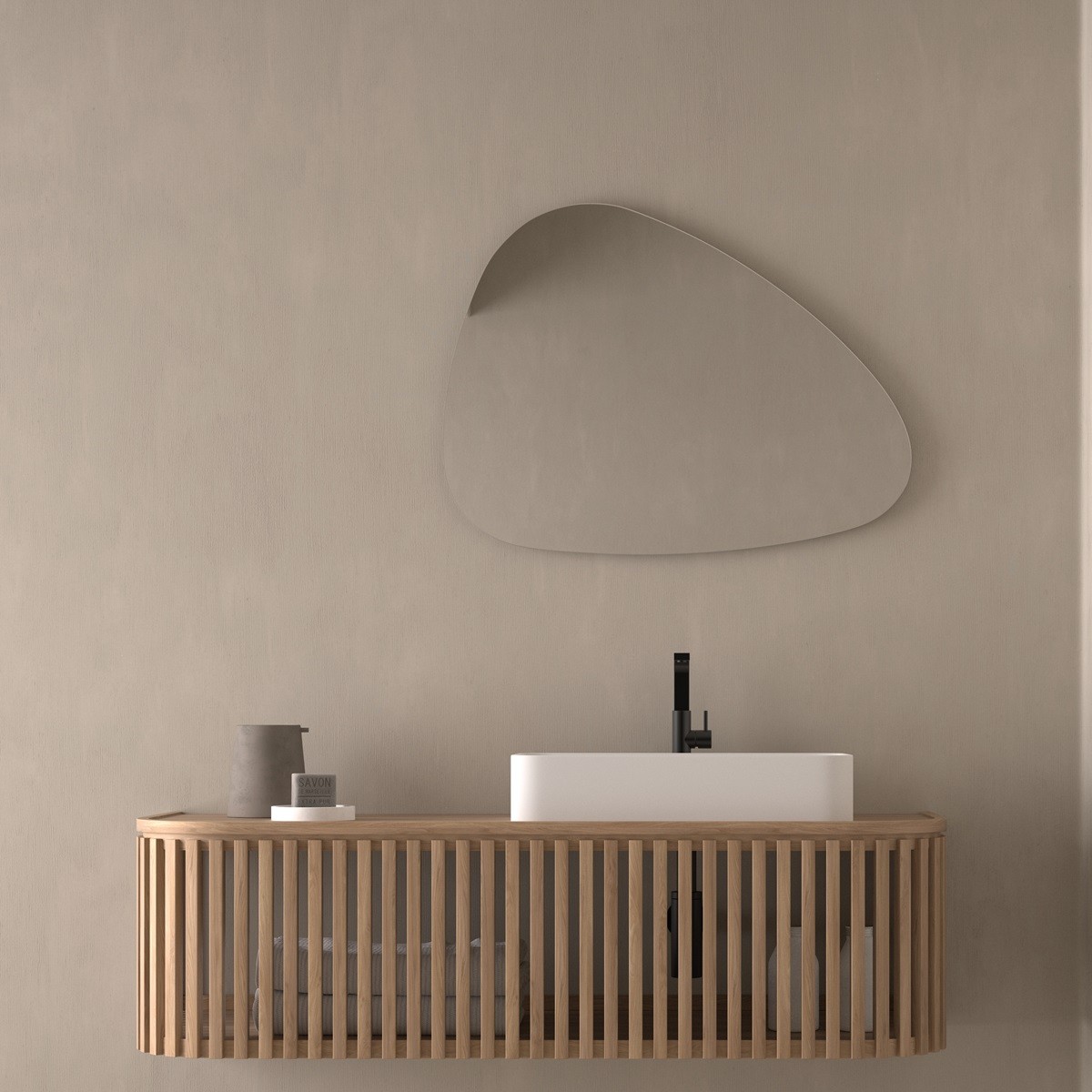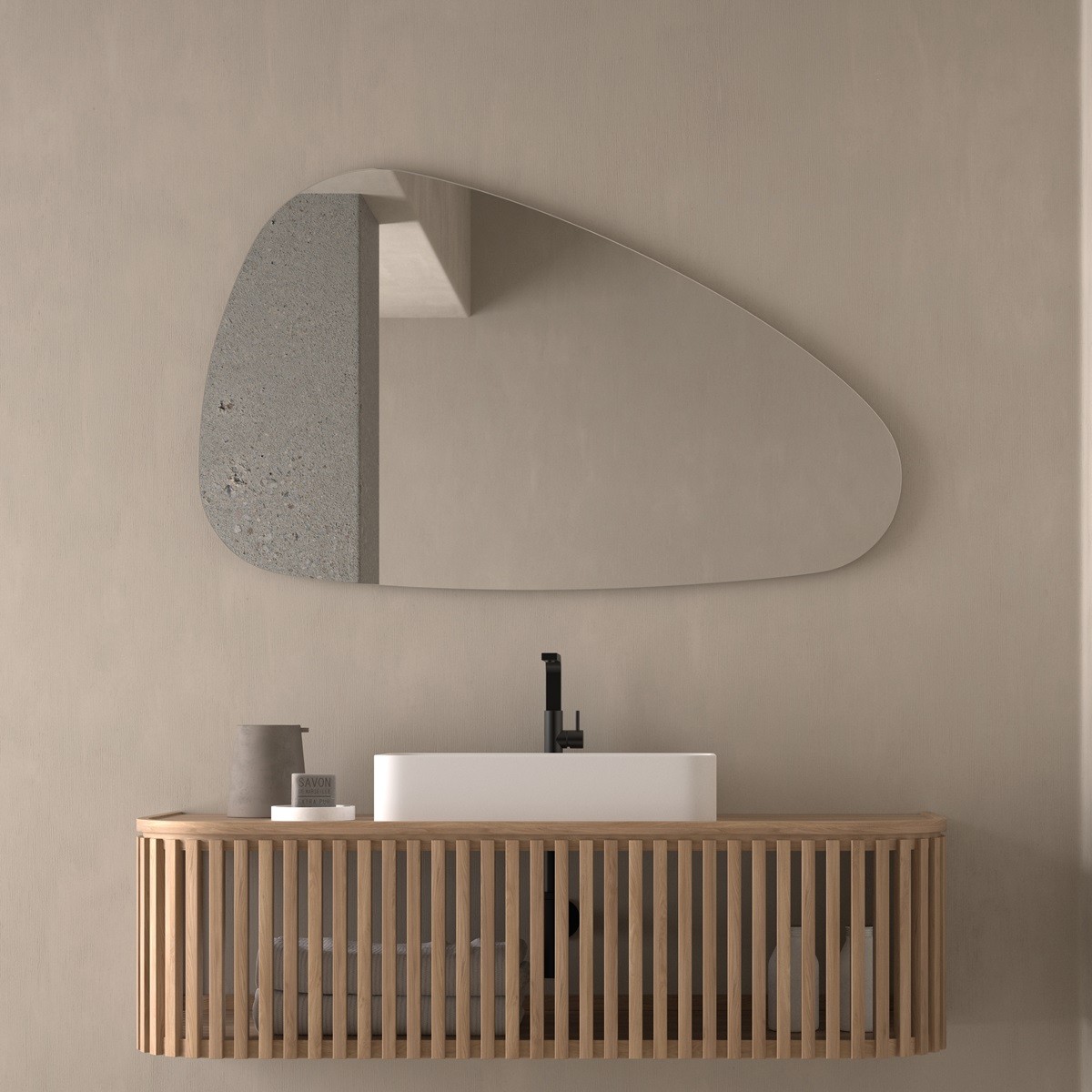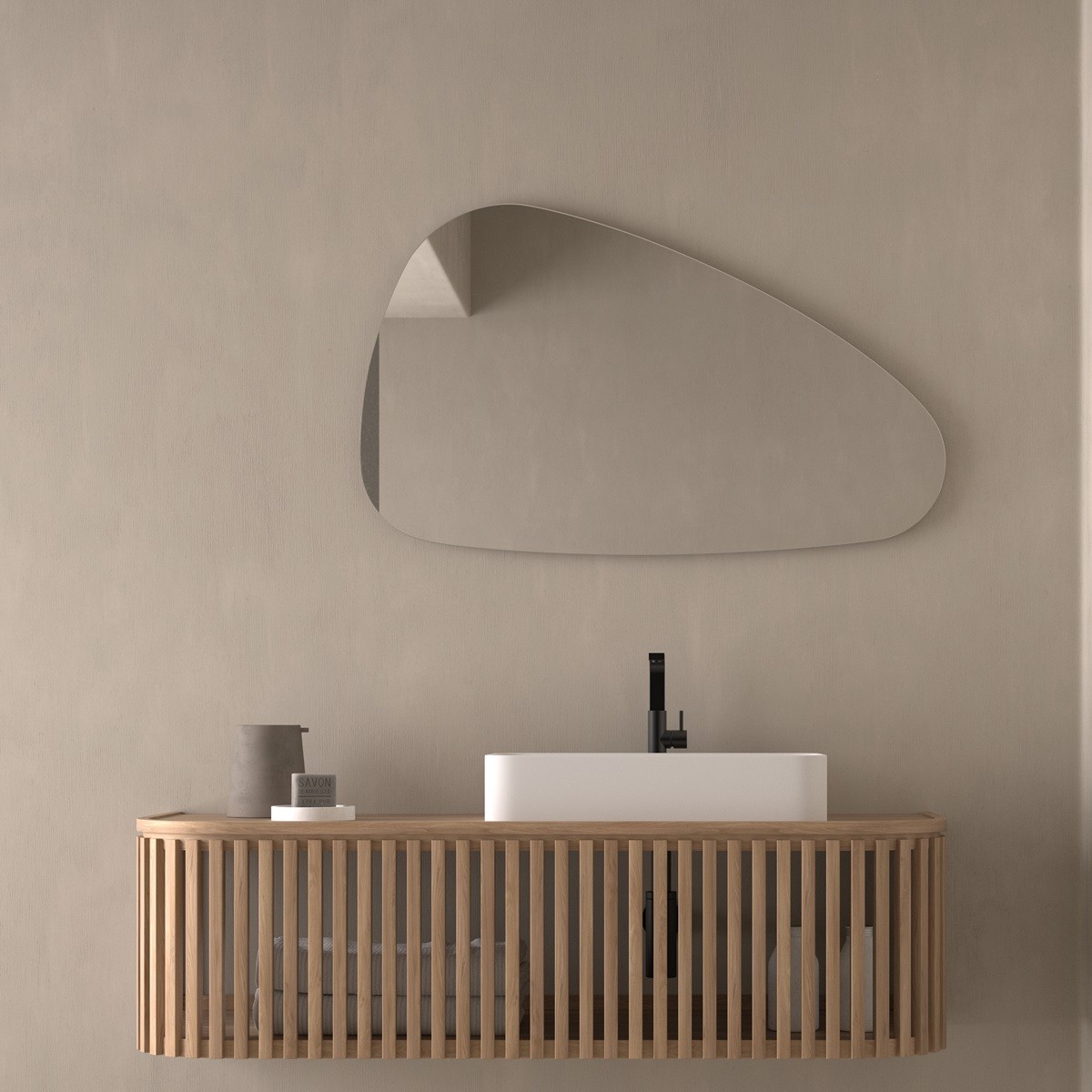 Este espejo asimétrico sin luz es una declaración de estilo para baños modernos y creativos. Su forma orgánica rompe con las líneas tradicionales, aportando dinamismo y personalidad al espacio. Ideal como espejo decorativo para baño, se adapta perfectamente a interiores contemporáneos, escandinavos o de inspiración artística. Su diseño limpio y sin bordes visibles acentúa la arquitectura del entorno, convirtiéndolo en un punto focal sutil pero sofisticado.