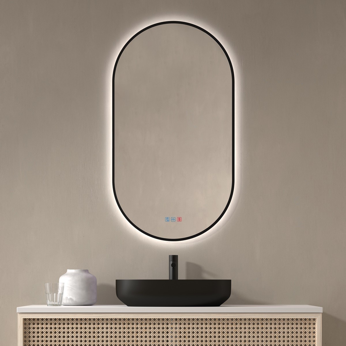 Este espejo ovalado retroiluminado para baño con contorno negro ofrece un equilibrio perfecto entre diseño contemporáneo y funcionalidad. Su luz LED cálida trasera proyecta un halo suave que aporta profundidad y calidez al ambiente, mientras que el marco pintado en negro enmarca la silueta con un contraste moderno y sofisticado. Ideal para baños con estética minimalista, industrial o escandinava. Incluye control táctil y función antivaho, lo que lo convierte en un espejo LED con marco negro tan práctico como decorativo.