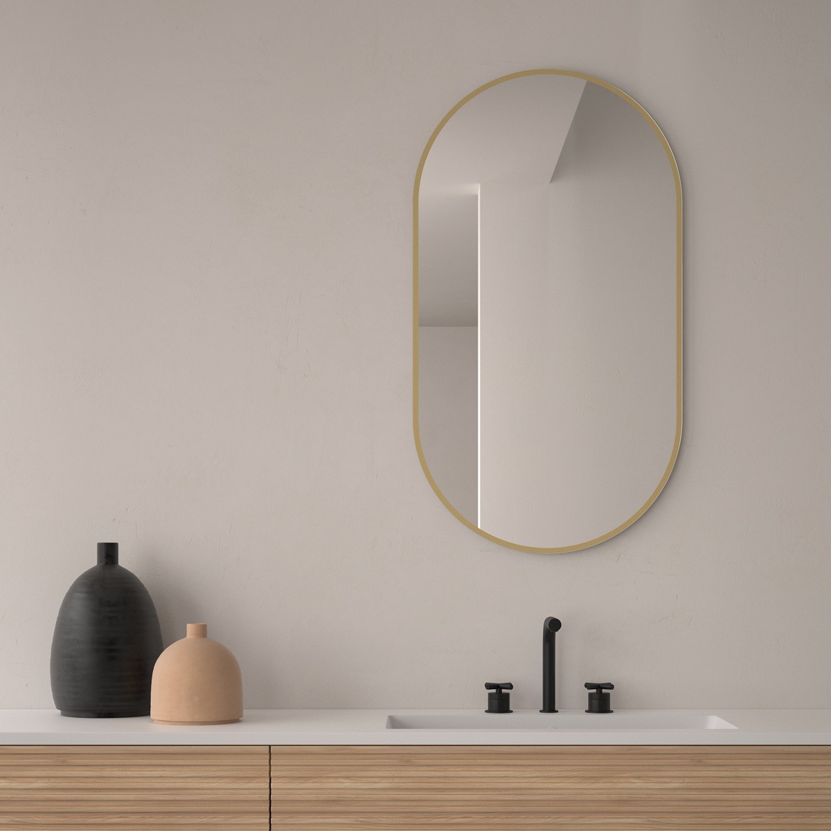 Este espejo ovalado sin luz para baño con contorno dorado destaca por su elegancia atemporal y líneas suaves que aportan armonía al espacio. Su forma estilizada y vertical alarga visualmente la pared, ideal para baños pequeños o tocadores modernos. El marco fino en color dorado añade un toque de calidez y sofisticación sin recargar la decoración. Perfecto como espejo decorativo ovalado para baño, combina funcionalidad y diseño en una pieza versátil y refinada.
