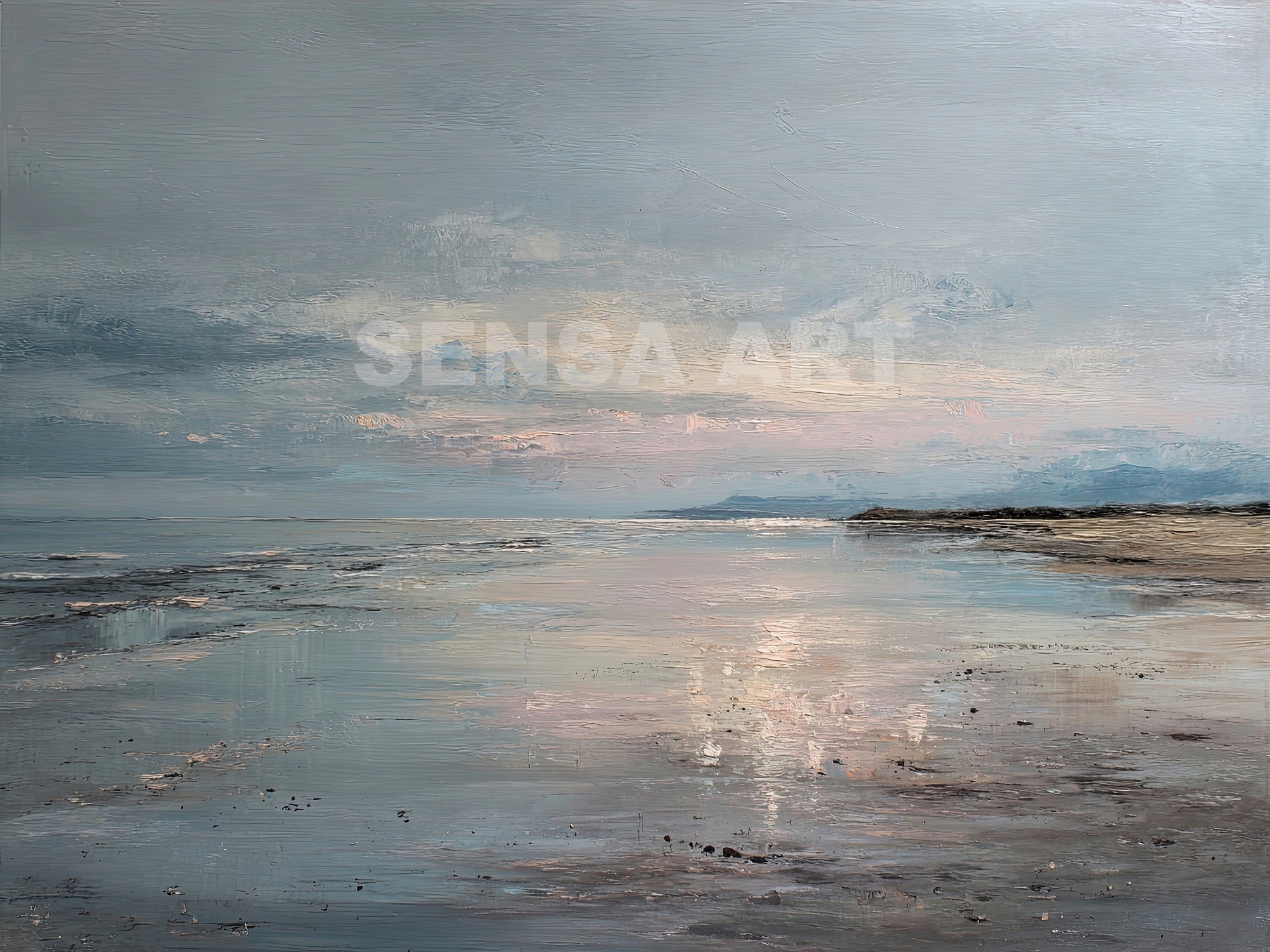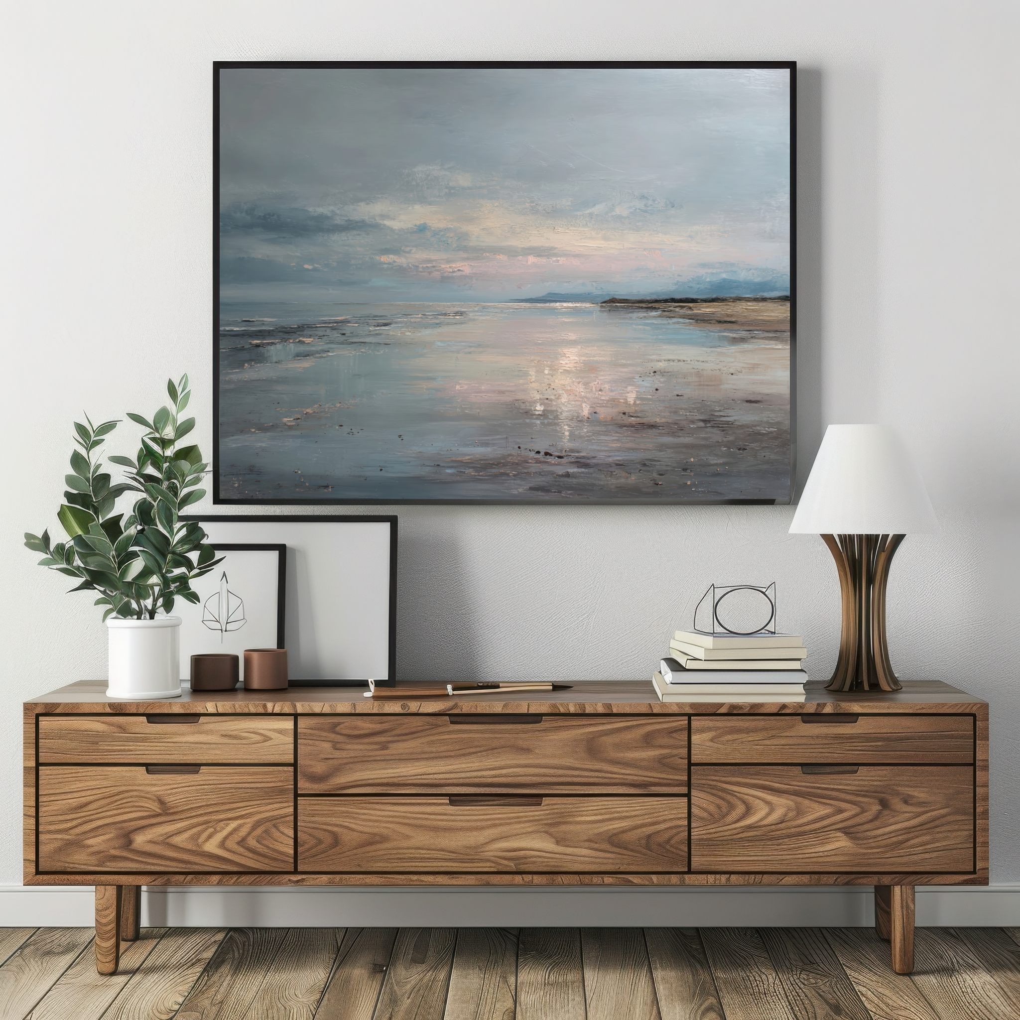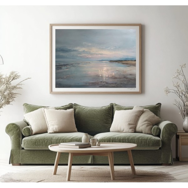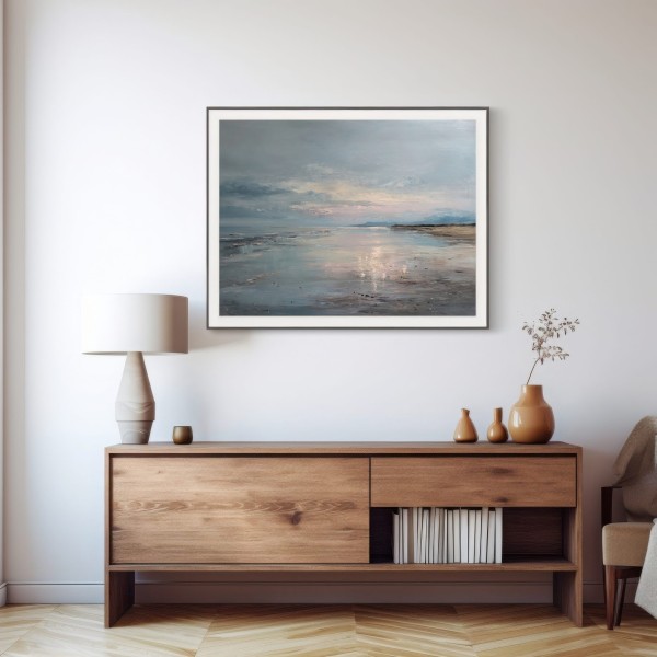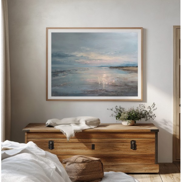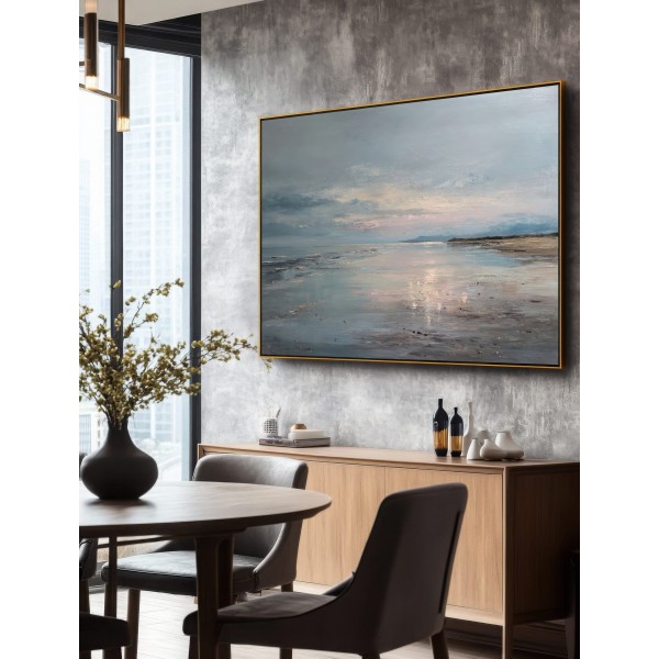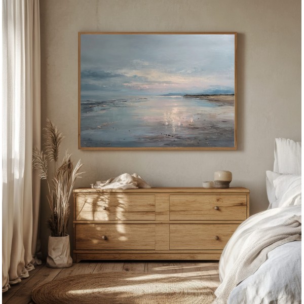 Este cuadro abstracto de costa serena captura la belleza tranquila del mar al atardecer con reflejos en tonos azules, arena y suaves toques rosados. La pintura, realizada con textura al óleo, evoca la calma de un horizonte infinito donde el agua y el cielo se funden. Su atmósfera poética transmite serenidad y equilibrio, perfecta para espacios modernos, minimalistas o de estilo natural. Una pieza elegante que aporta luz y profundidad, ideal para crear un ambiente relajante en salones, dormitorios o zonas de descanso.
