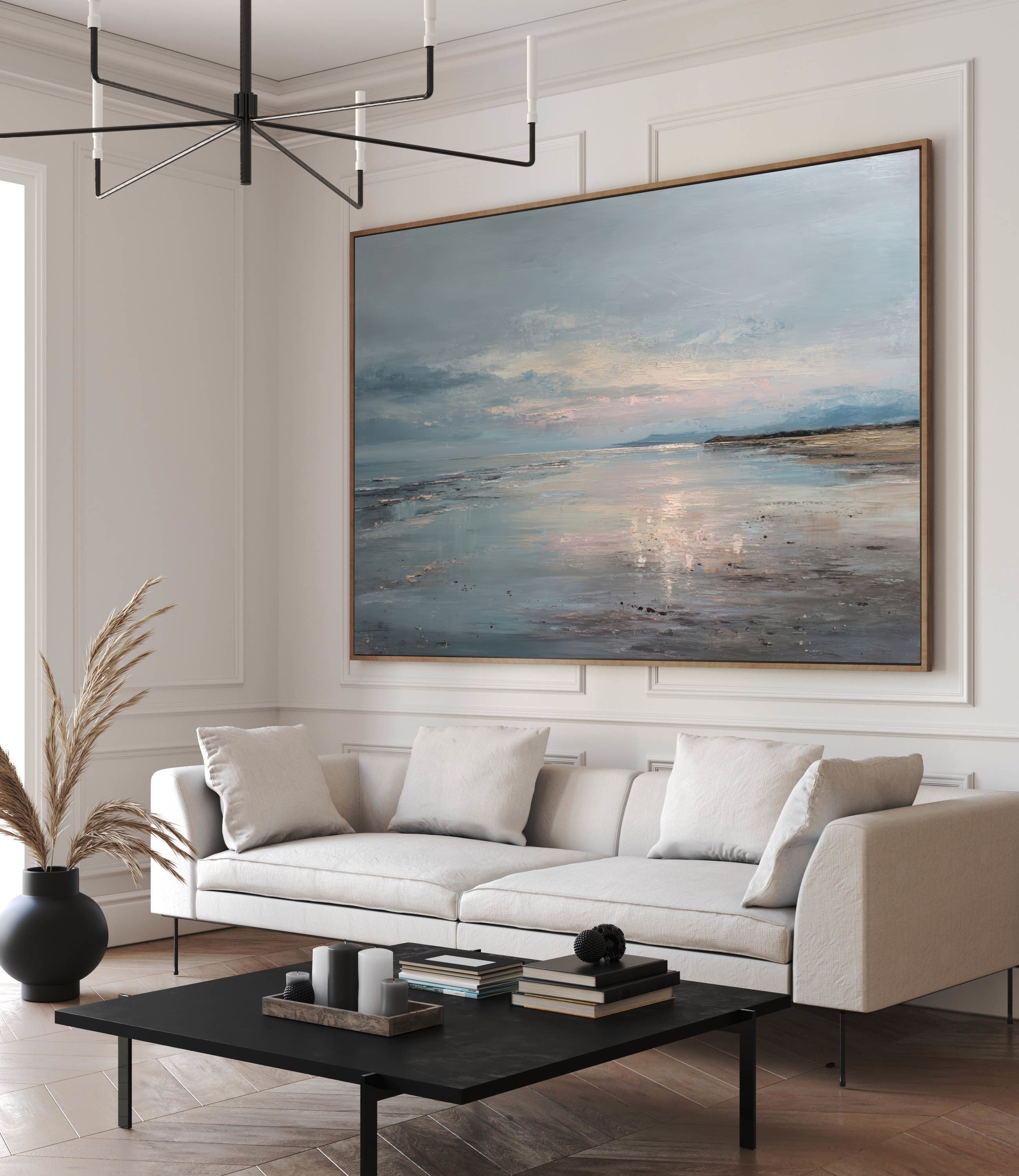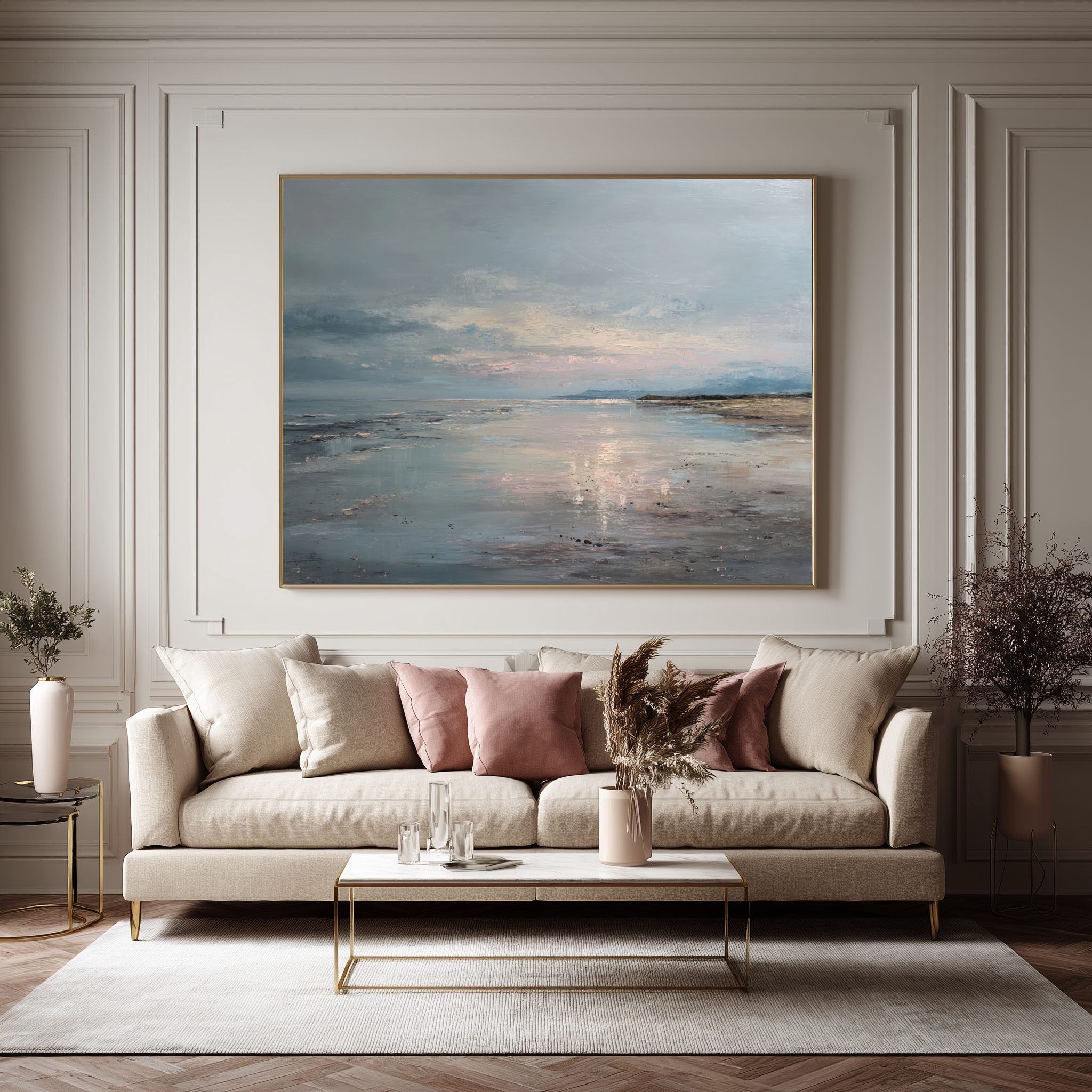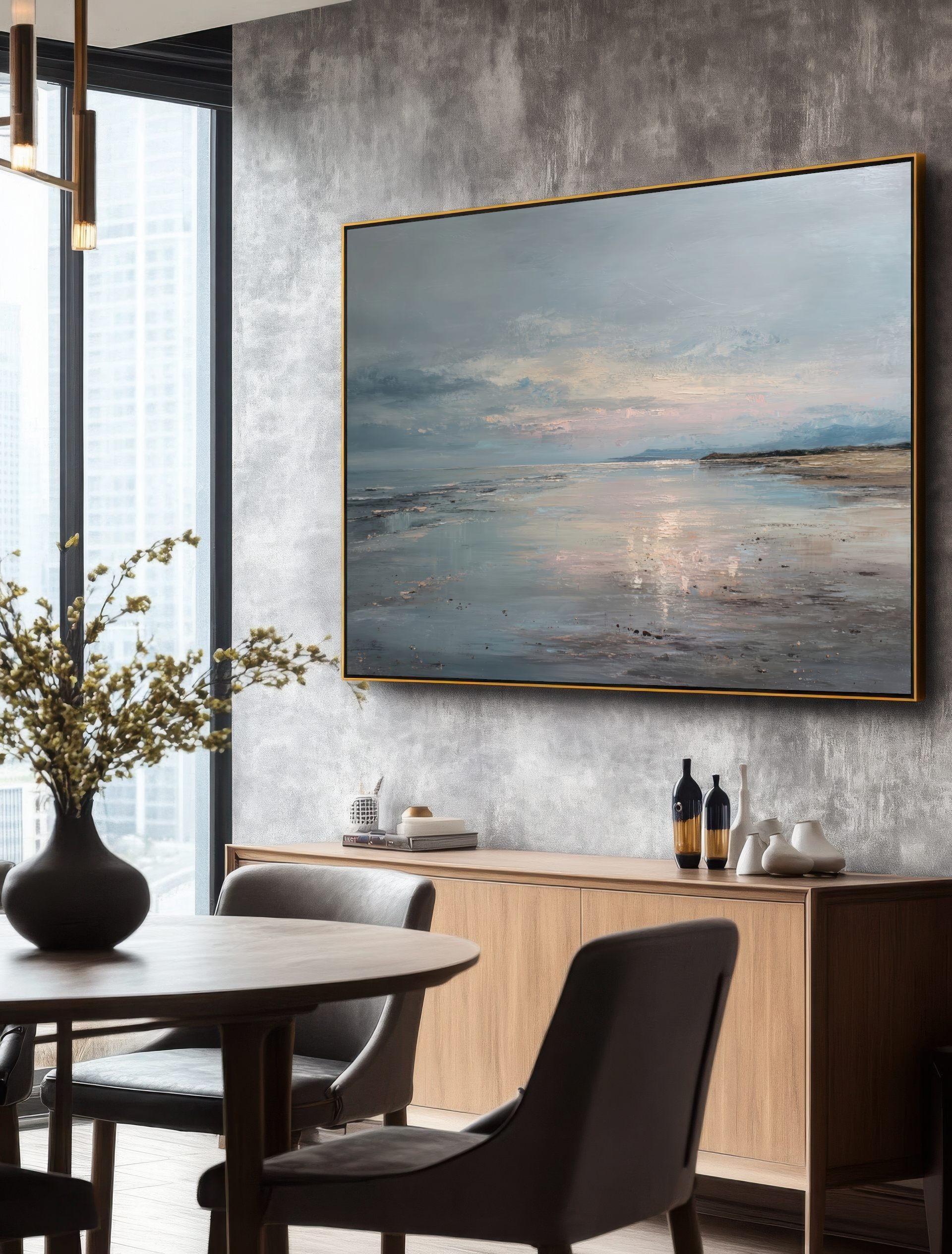 Este cuadro abstracto de costa serena captura la belleza tranquila del mar al atardecer con reflejos en tonos azules, arena y suaves toques rosados. La pintura, realizada con textura al óleo, evoca la calma de un horizonte infinito donde el agua y el cielo se funden. Su atmósfera poética transmite serenidad y equilibrio, perfecta para espacios modernos, minimalistas o de estilo natural. Una pieza elegante que aporta luz y profundidad, ideal para crear un ambiente relajante en salones, dormitorios o zonas de descanso.