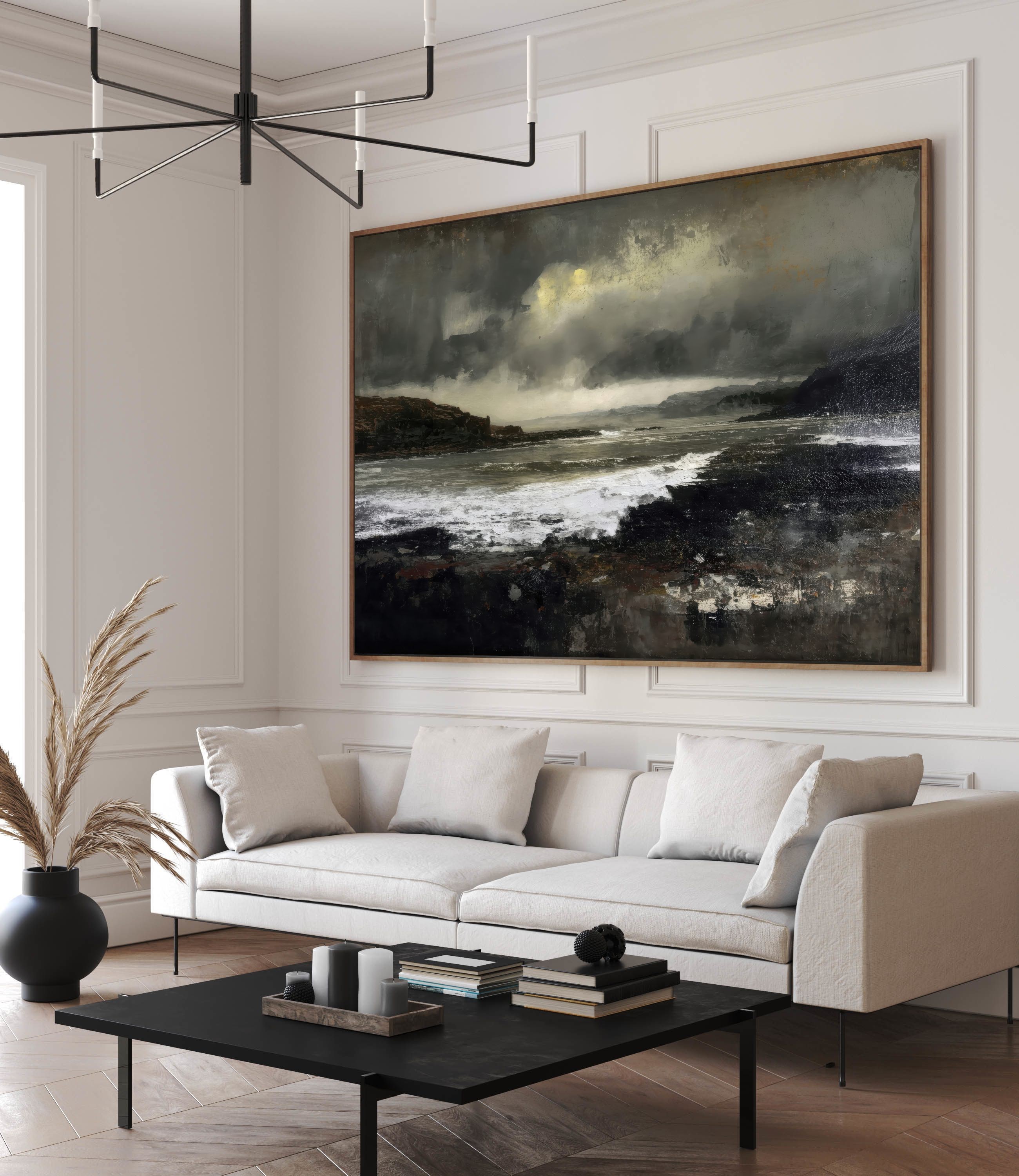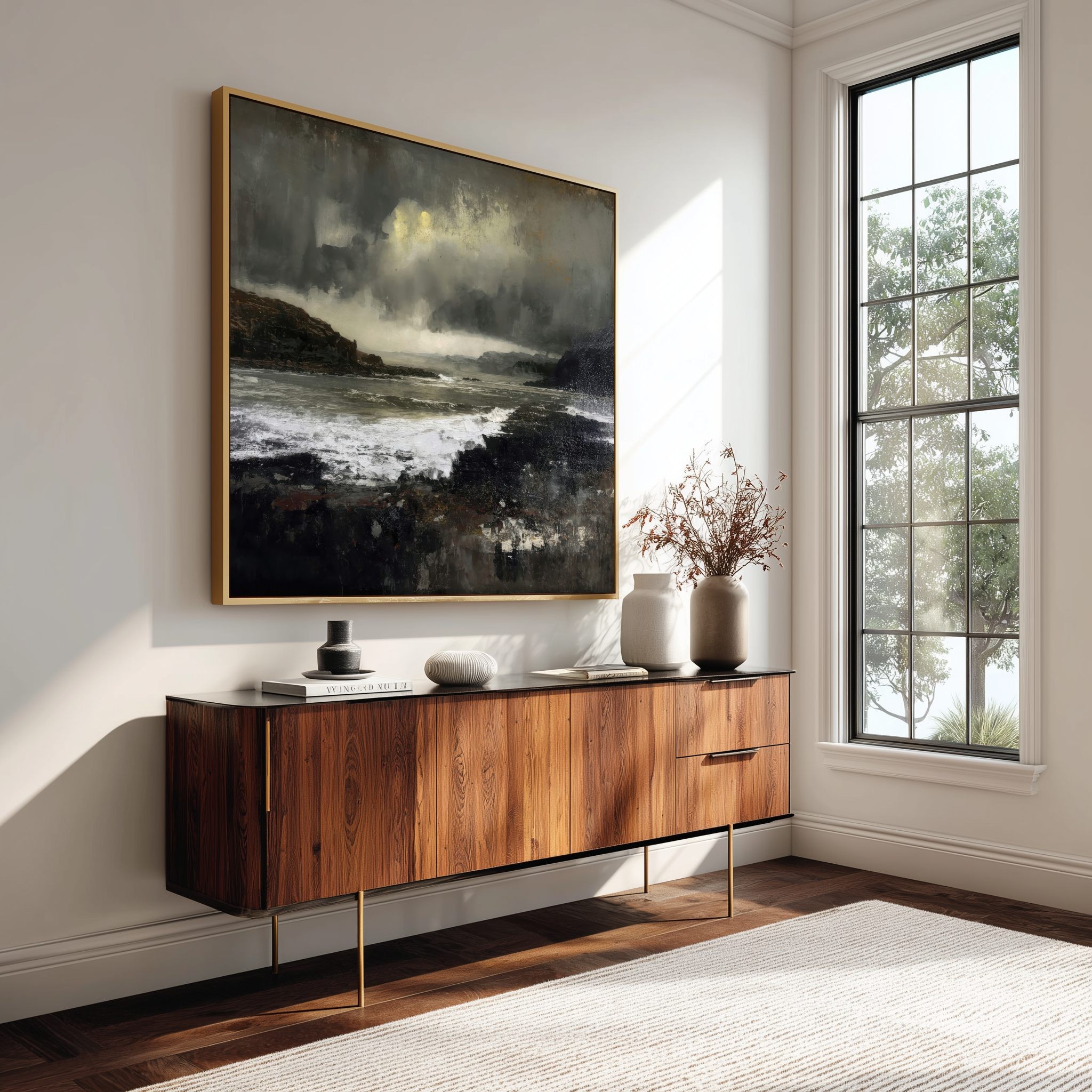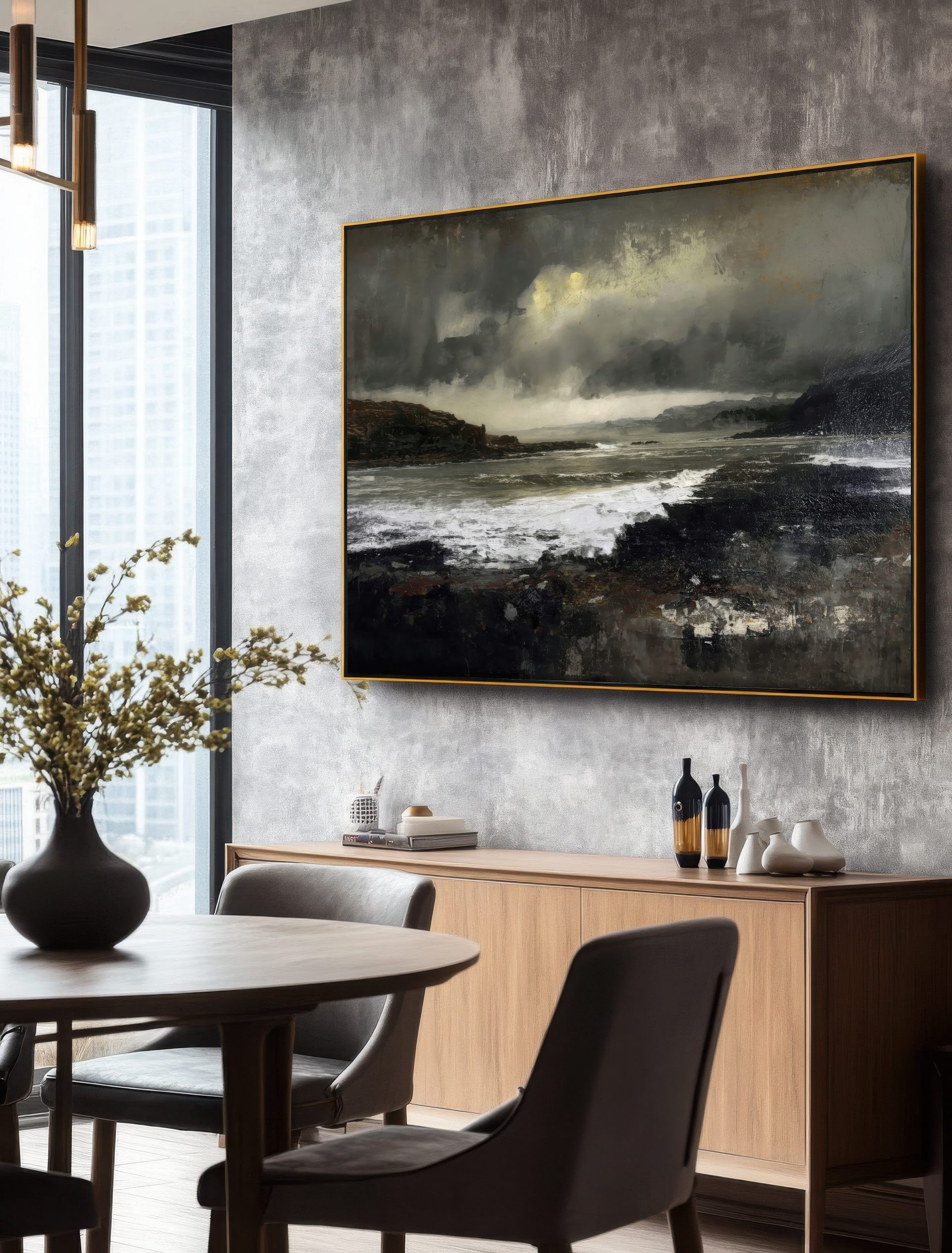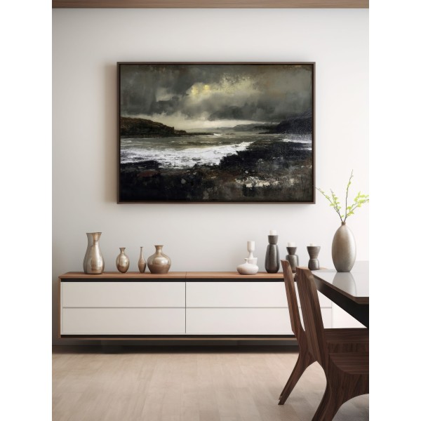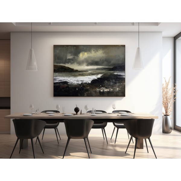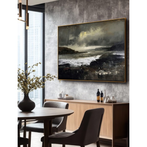 El cuadro abstracto Marea Oscura representa la fuerza del océano en su estado más salvaje y poético. Con una combinación de tonos grises, marrones y matices dorados, esta obra captura el dramatismo del mar bajo un cielo tormentoso. Las pinceladas densas al óleo y la textura rugosa evocan el movimiento de las olas y la energía de la naturaleza. Perfecto para interiores modernos, industriales o minimalistas, este cuadro aporta profundidad visual, elegancia y una poderosa sensación de calma dentro del caos natural.