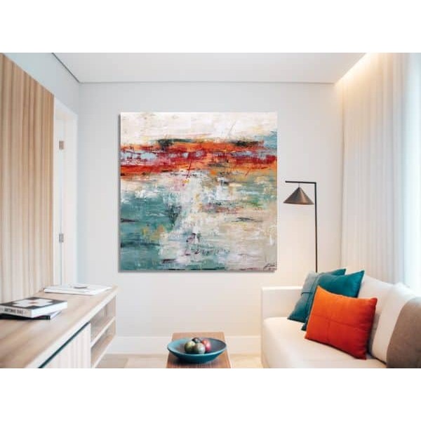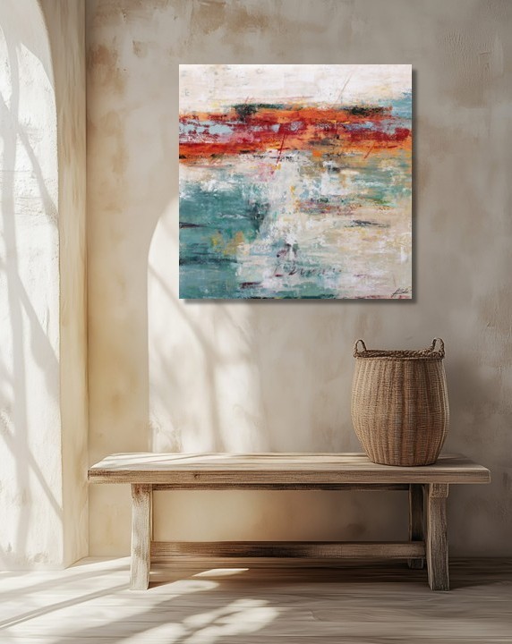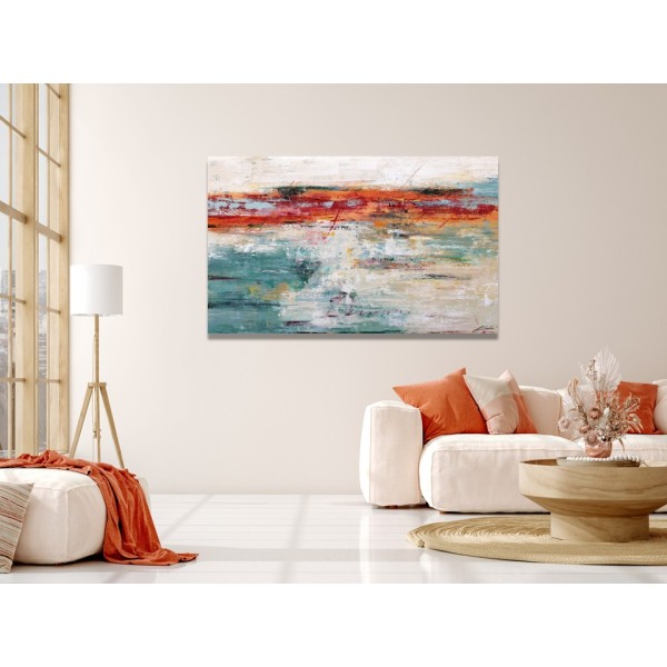Este vibrante cuadro abstracto moderno combina fuerza cromática y textura en una composición artística llena de energía. Las franjas horizontales en rojos intensos, ocres cálidos y verdes turquesa crean un contraste dinámico que aporta profundidad y carácter a la obra.
