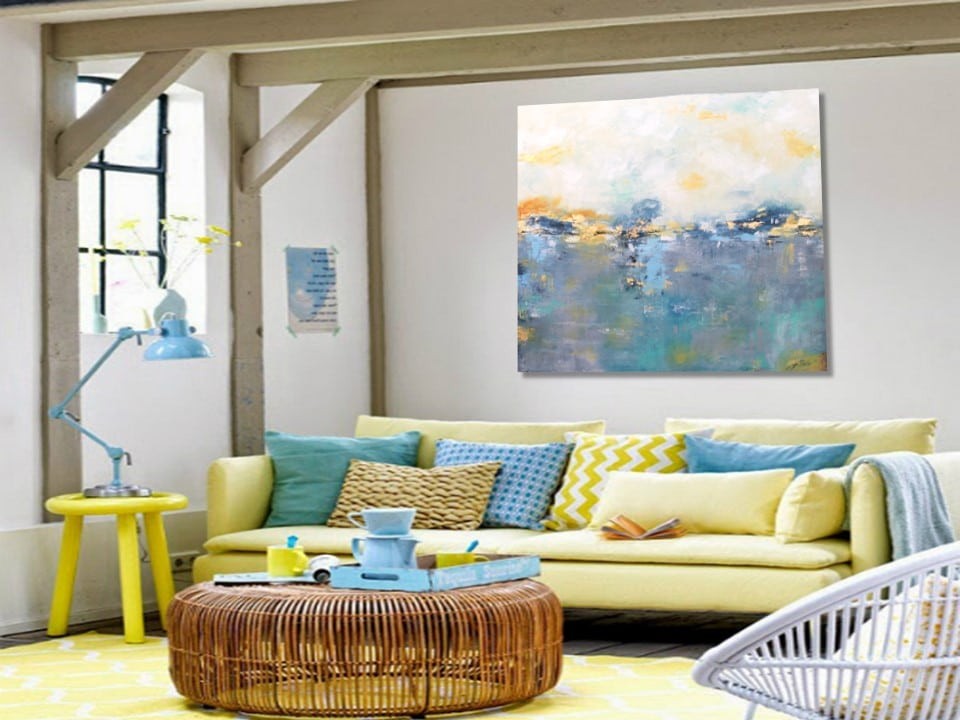 Cuadro original pintado a mano en acrílico sobre lienzo, con ligeras texturas. Tonalidades azules, amarillos, gris y un ligero toque de pan de oro en las zonas centrales. Obra con gran personalidad y carácter, ideal para decorar un salón comedor, una oficina o un despacho.