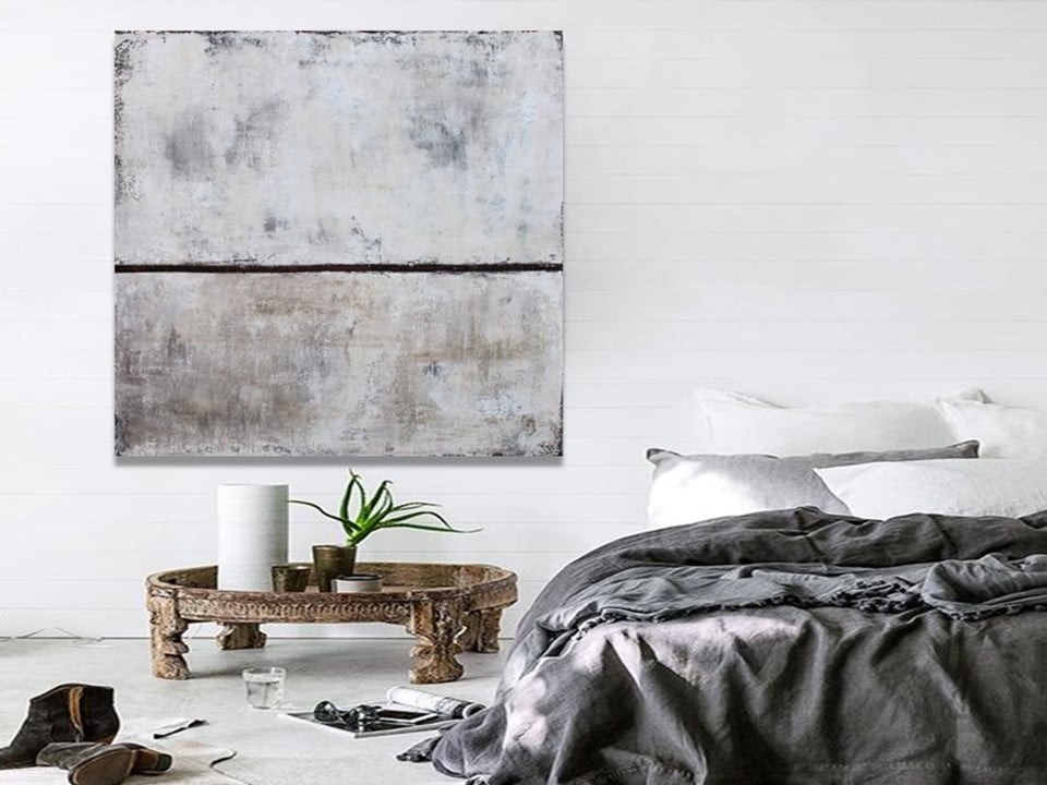 Cuadro original pintado a mano en acrílico sobre lienzo, con texturas. Tonalidades beiges, blanco roto, marrones y tonalidades arena, con bastante textura y pintado a espátula. La franja central en marrón oscuro. Ideal para decorar un salón comedor, una oficina o un despacho.