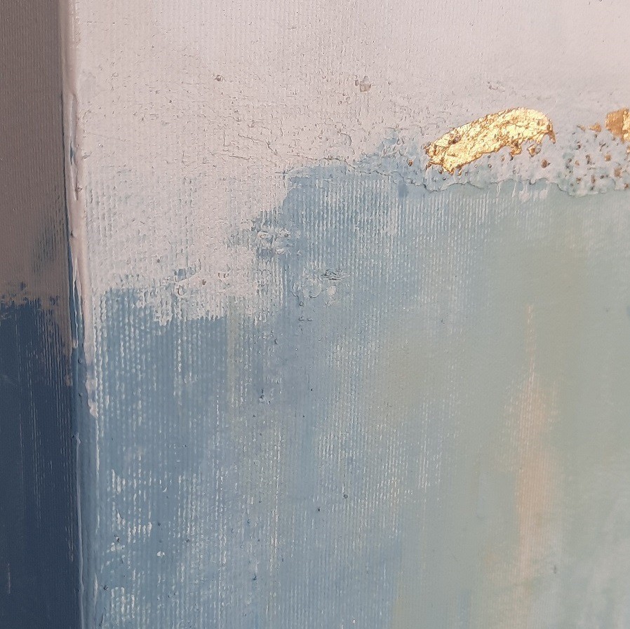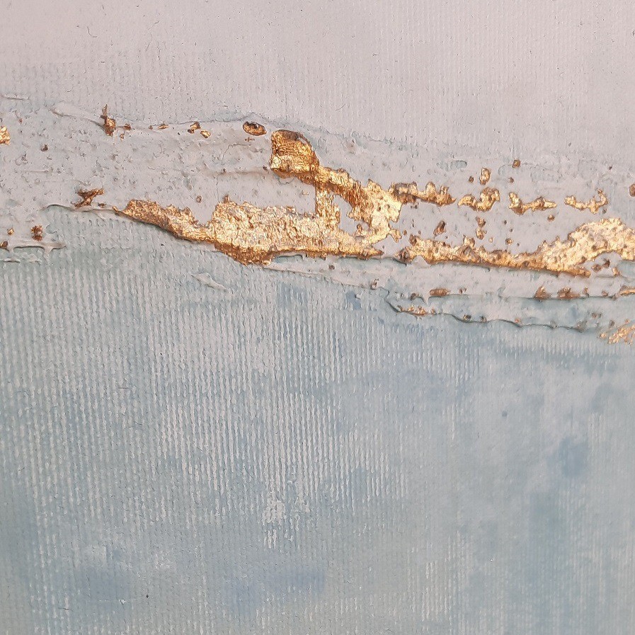 Cuadro original pintado a mano en acrílico sobre lienzo, con ligeras texturas. Fondo verde agua con pinceladas blancas. Contiene pan de oro.