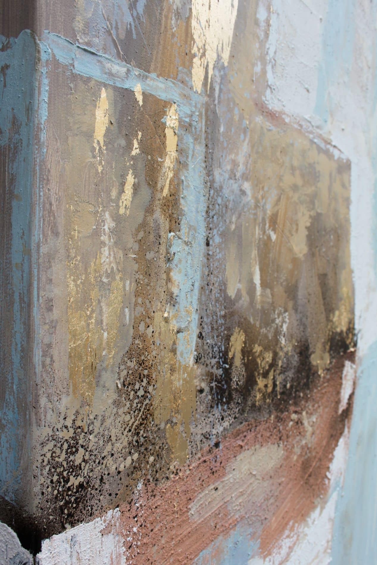 Cuadro pintado a mano en acrílico sobre lienzo., en tonalidades marrones, tejas, azul bebé, beige y toques de pan de oro . Fondo en blanco roto. Ideal para posicionarlo en vertical. Totalmente acabado y montado, listo para colgar en su pared, con texturas arenosas.