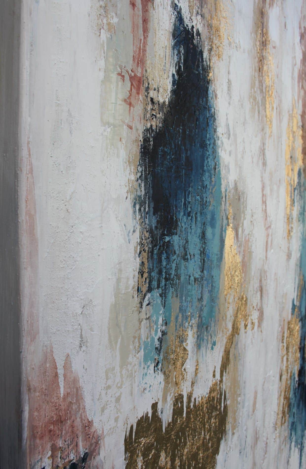 Cuadro pintado a mano en acrílico sobre lienzo., en tonalidades marrones, ocres, azules, con toques de pan de oro . Fondo en blanco roto. Ideal para posicionarlo en vertical. Totalmente acabado y montado, listo para colgar en su pared, con texturas arenosas.