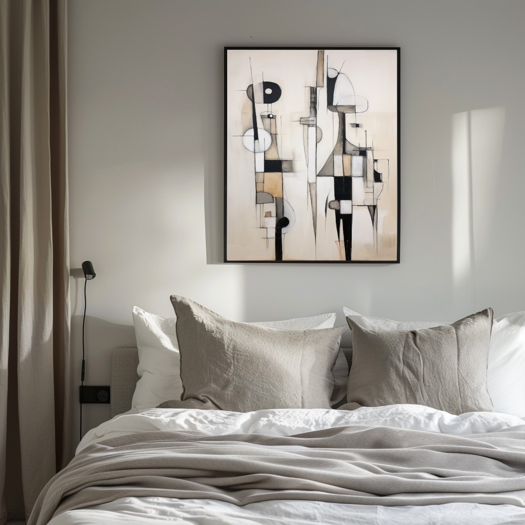 Este cuadro abstracto combina formas geométricas alargadas y redondeadas en una paleta neutra de blanco, negro y beige. La composición lineal y elegante añade una sensación de equilibrio y sofisticación a cualquier espacio. Perfecto para quienes buscan una obra moderna y minimalista que aporte un toque artístico y refinado, ideal para salas, oficinas o ambientes contemporáneos.