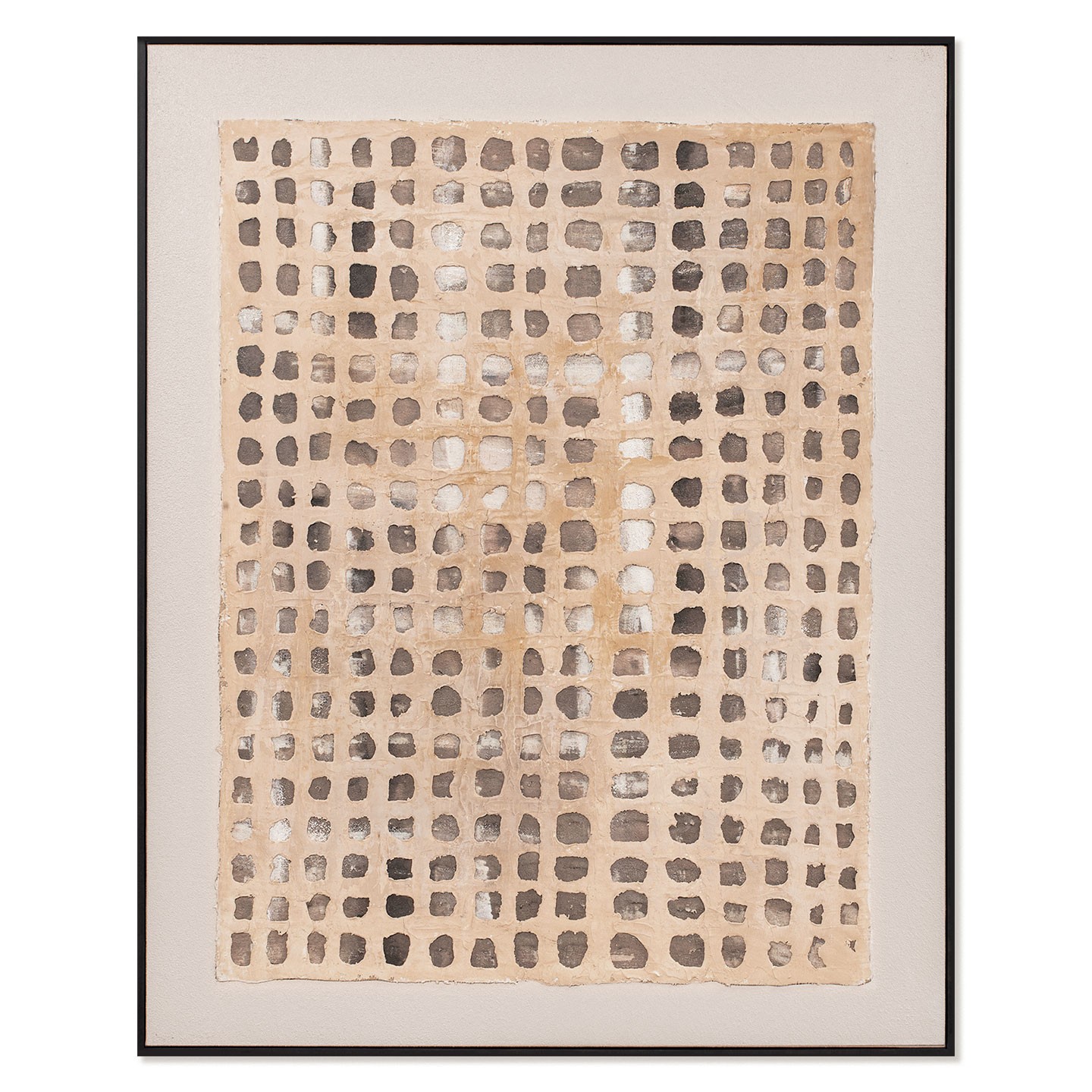 El cuadro decorativo Jalisco presenta un diseño abstracto de patrón cuadriculado en tonos neutros como beige, gris y blanco. Una decoración tallada, aplicada sobre la pintura acrílica, crea un original juego de luces y sombras. El papel amatl, producido en Jalisco desde la época precolombina, es la inspiración para el refinado inserto de esta obra.