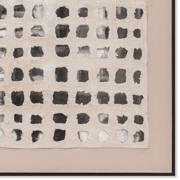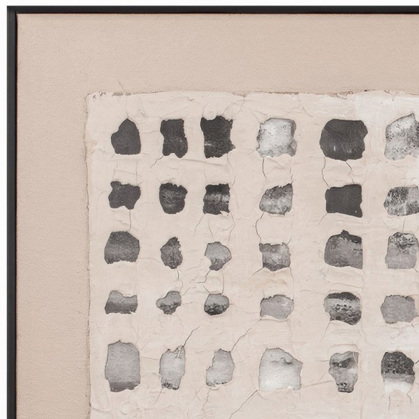 El cuadro decorativo Belize presenta un diseño abstracto de patrón cuadriculado en tonos neutros como beige, gris y blanco. Una decoración tallada, aplicada sobre la pintura acrílica, crea un original juego de luces y sombras. El papel amatl, producido en Jalisco desde la época precolombina, es la inspiración para el refinado inserto de esta obra.