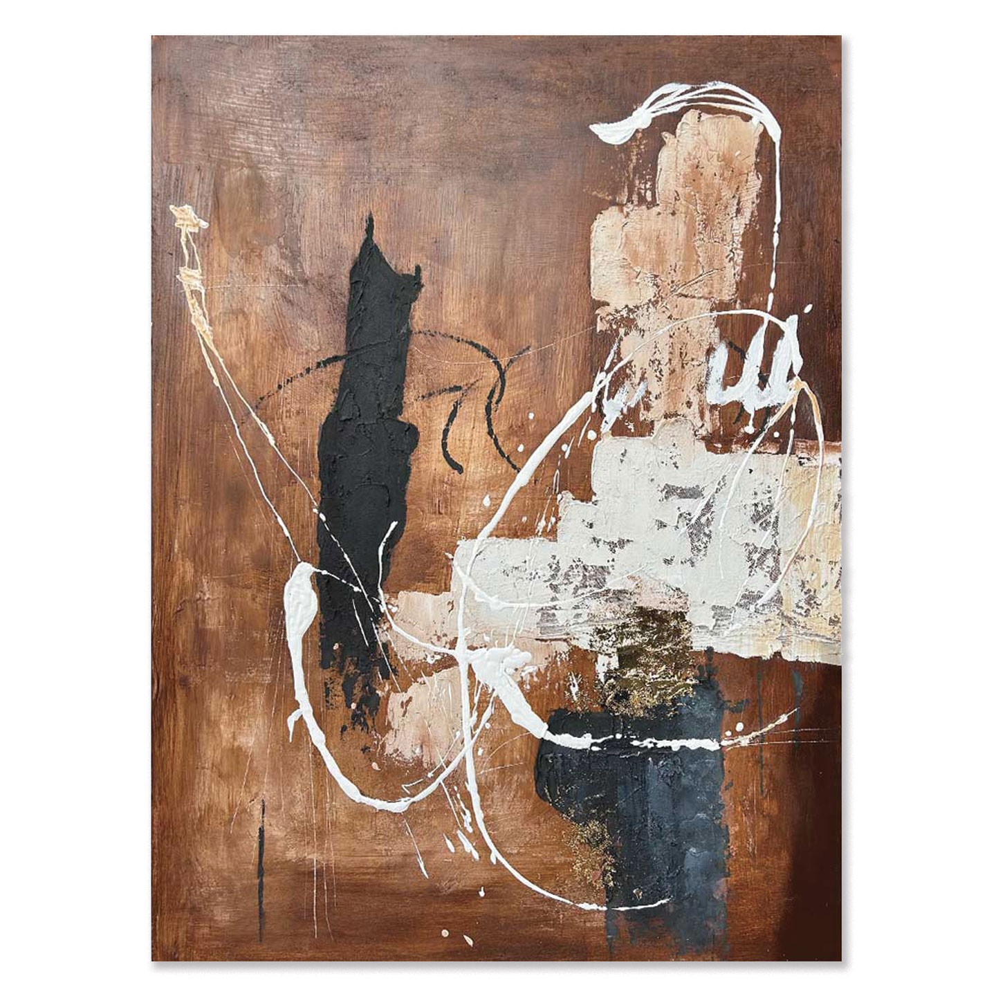 El cuadro decorativo abstracto Rust combina tonos cálidos marrones con detalles en blanco y negro, destacando por sus trazos dinámicos y texturas modernas. Su diseño contemporáneo aporta profundidad y carácter, ideal para salones, oficinas o espacios con estilos industriales o minimalistas.