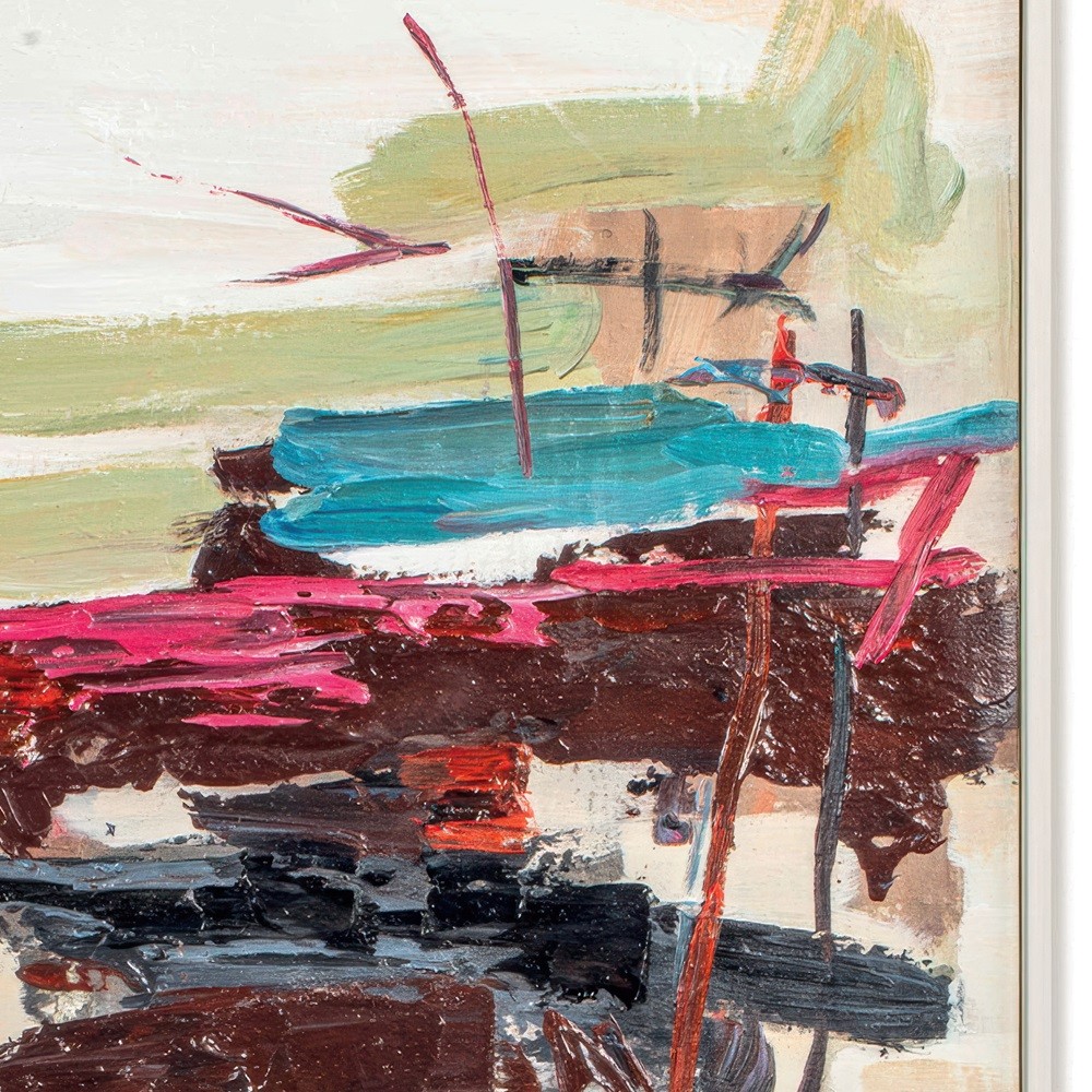 El cuadro decorativo abstracto Focus destaca por su explosión de colores vivos como azul, rosa, amarillo y verde, contrastando con tonos neutros de fondo. Su diseño dinámico y pinceladas expresivas aportan energía y personalidad a cualquier espacio.
