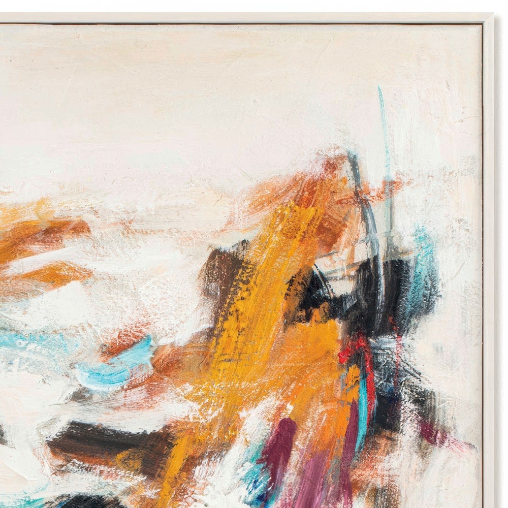El cuadro decorativo abstracto Amuse combina colores vibrantes como amarillo, turquesa, burdeos y blanco, creando una composición llena de energía y movimiento. Su diseño expresivo y pinceladas audaces lo hacen perfecto para salones, oficinas o estudios creativos.