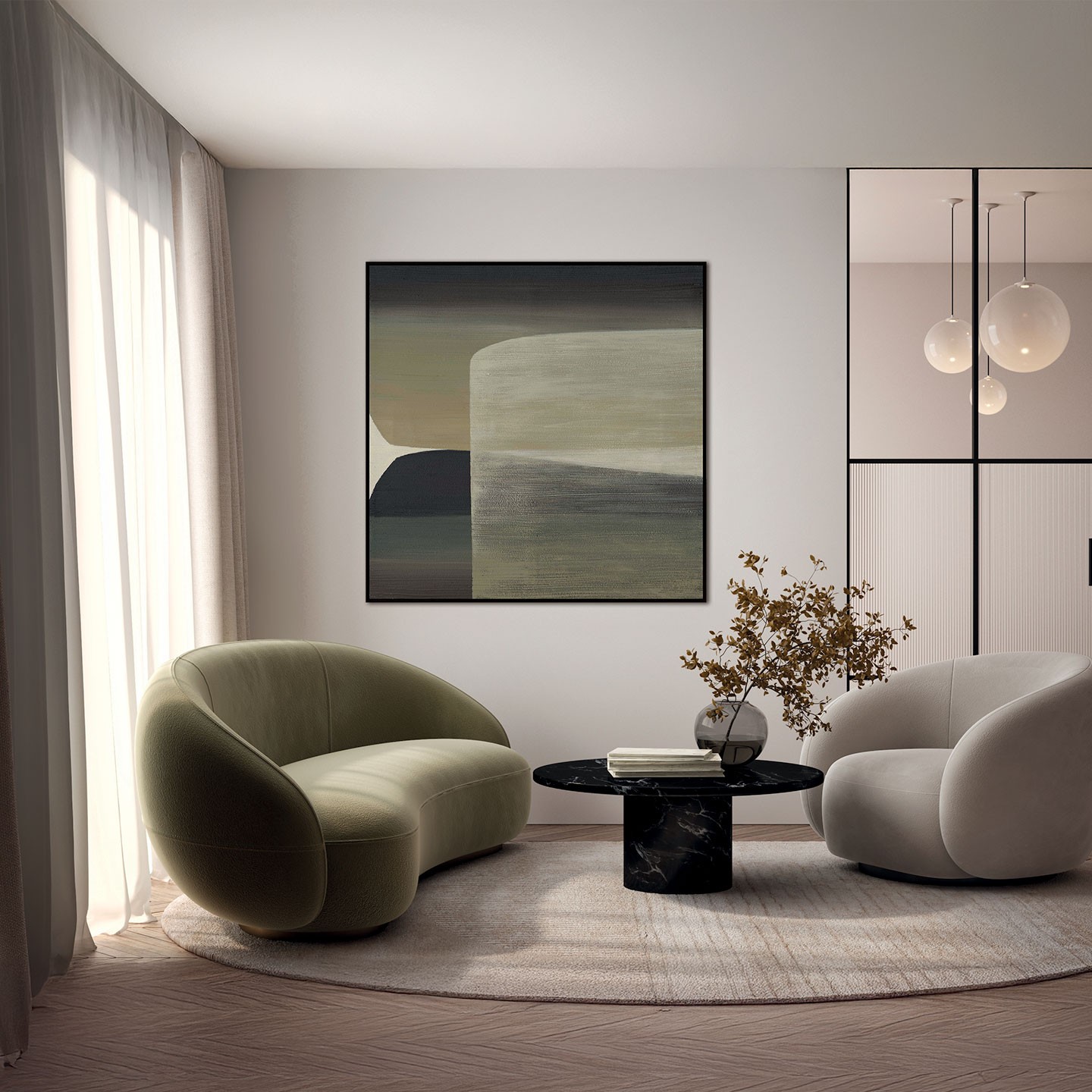 El cuadro decorativo abstracto Kubrick presenta un diseño minimalista en tonos neutros como beige, gris y verde oliva. Sus formas suaves y líneas difuminadas crean una composición serena y equilibrada, ideal para decoraciones modernas o escandinavas.