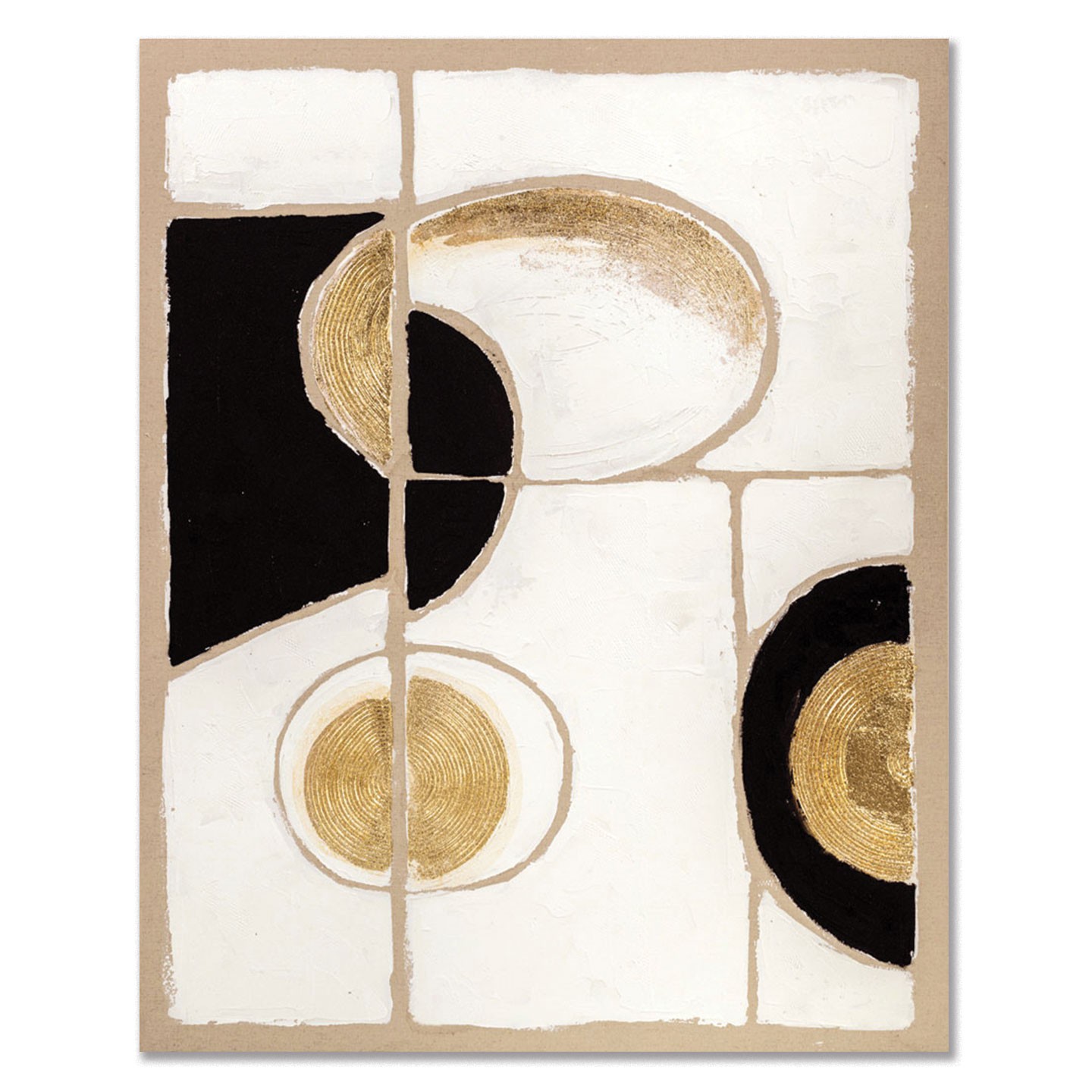 El cuadro decorativo abstracto Black and Gold 2 combina colores blanco, negro y dorado en un diseño geométrico con texturas elegantes. Las formas curvas y los detalles dorados añaden un toque de lujo y sofisticación, ideal para espacios modernos o contemporáneos.
