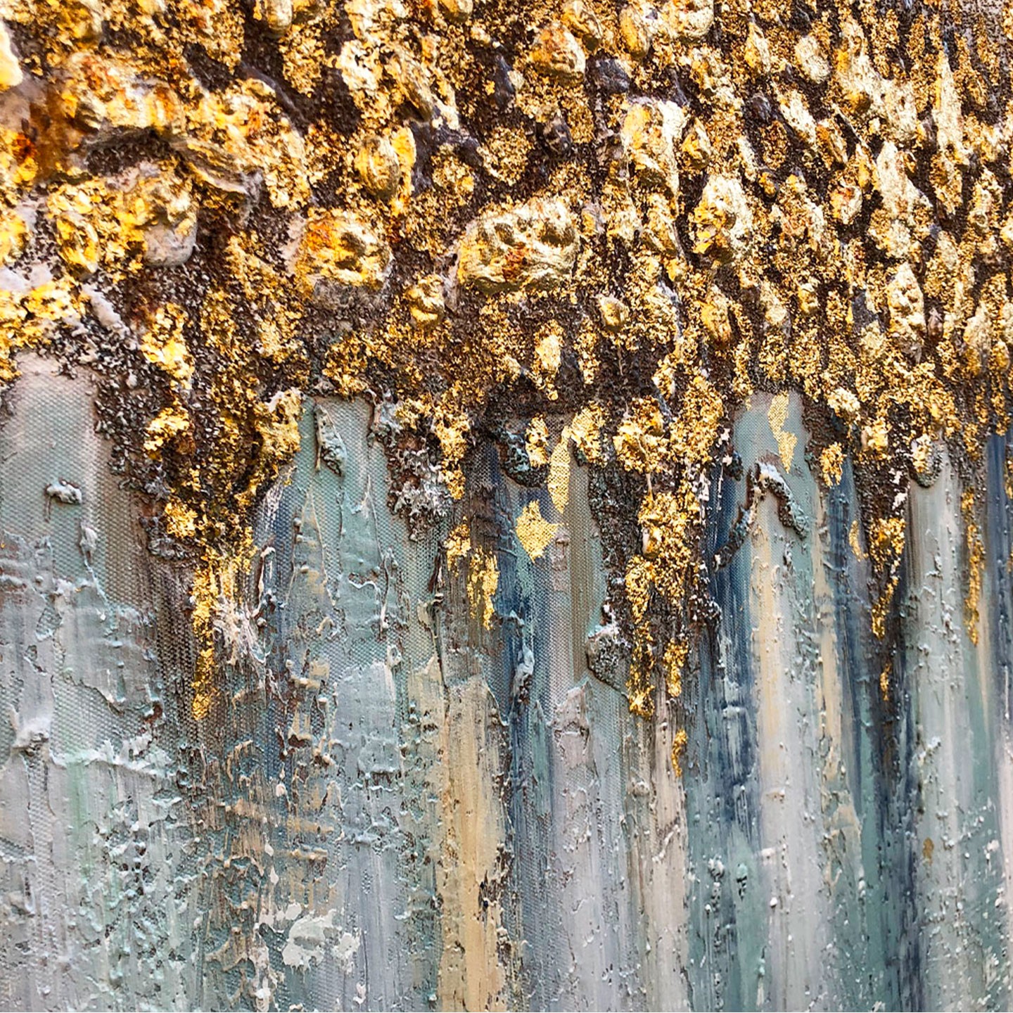 El cuadro decorativo abstracto Horizon combina tonos azulados, blancos y dorados en un diseño texturizado que evoca elegancia y frescura. Los detalles dorados en relieve añaden un toque de lujo y profundidad, mientras que los degradados en azul aportan serenidad al ambiente.