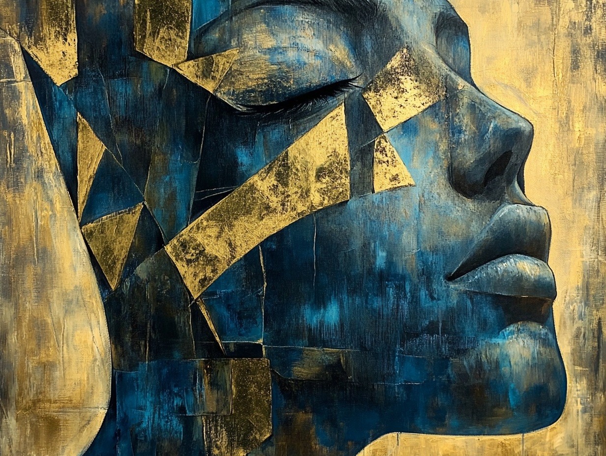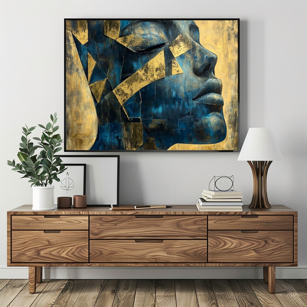 Este cuadro decorativo abstracto en tonos azul profundo y dorado es una pieza sofisticada y elegante, ideal para realzar cualquier espacio con un toque artístico exclusivo. Su diseño moderno, con un rostro en calma fragmentado por formas geométricas doradas, transmite serenidad y lujo. Perfecto para salones, oficinas o dormitorios contemporáneos. Esta obra de arte aporta distinción y profundidad visual. Compra ahora y transforma tu hogar con estilo vanguardista.