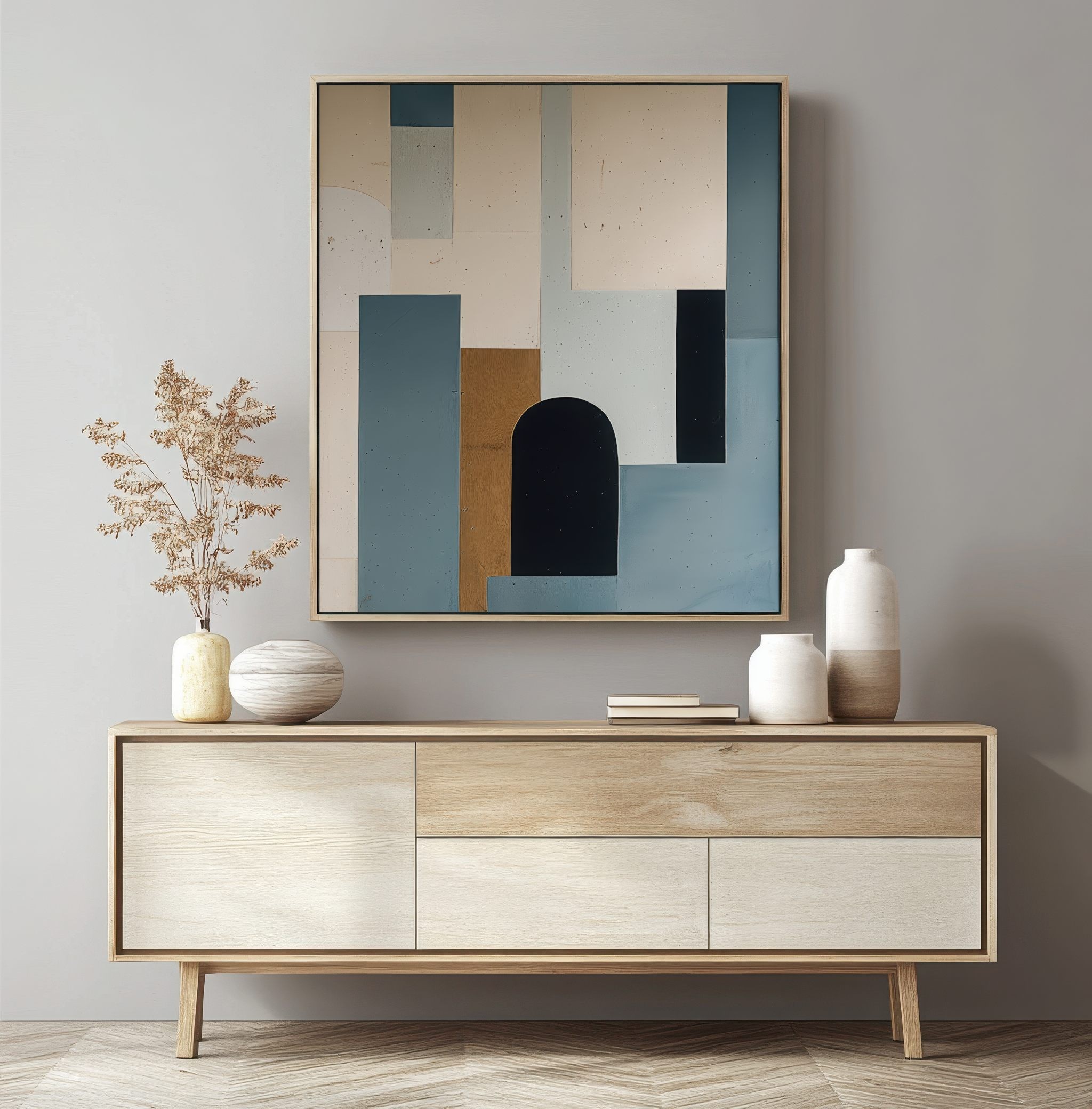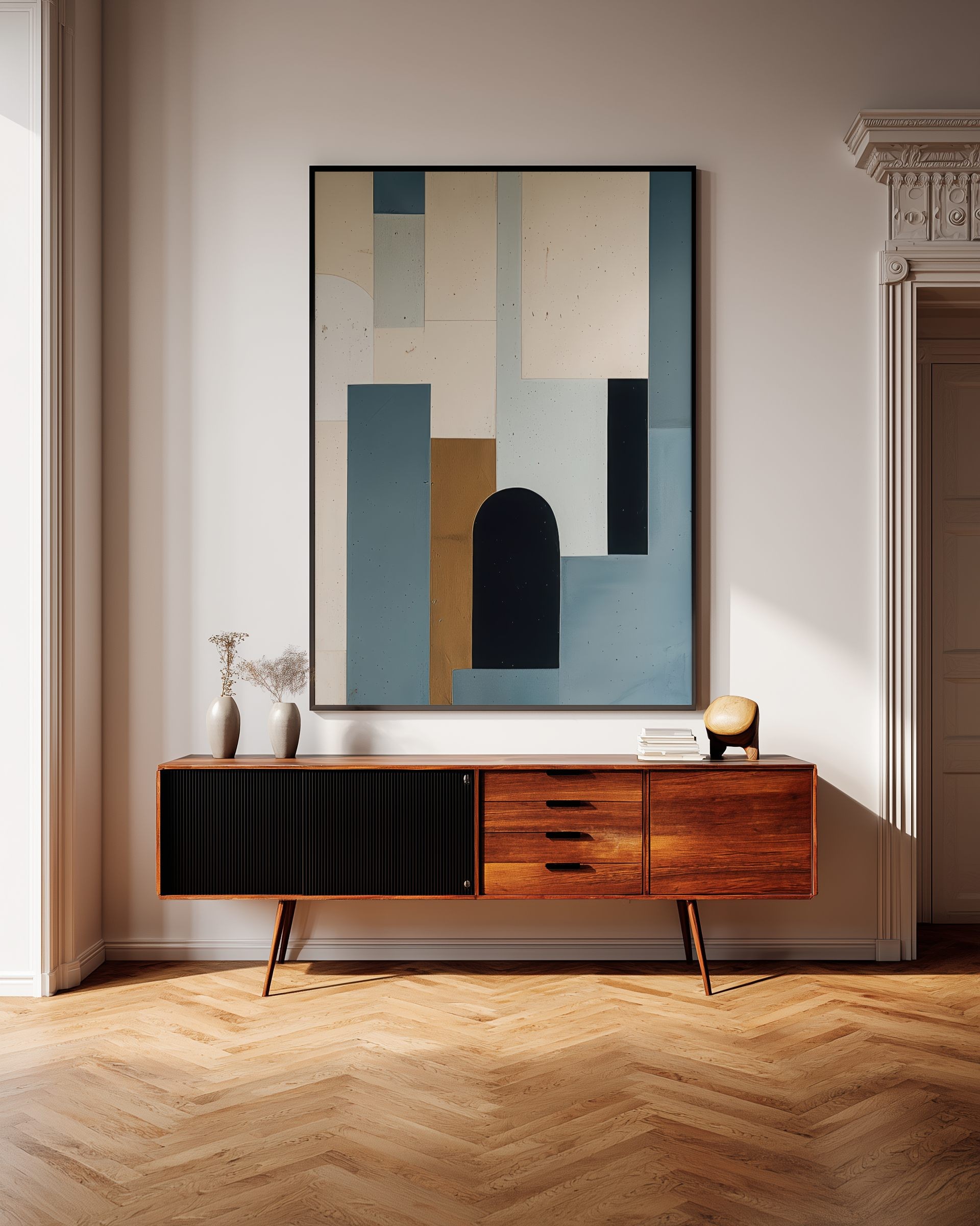 Este cuadro abstracto geométrico combina formas rectangulares y arcos en una composición minimalista de gran equilibrio visual. Su paleta en tonos neutros, azules, beige y negro crea un diseño sofisticado y contemporáneo, ideal para espacios modernos. Perfecto para decoración minimalista en salones, oficinas o estudios, esta obra aporta serenidad y elegancia con un estilo arquitectónico único. Su carácter versátil lo convierte en una pieza clave para quienes buscan un arte exclusivo que combine simplicidad, estructura y estética moderna en cualquier ambiente.