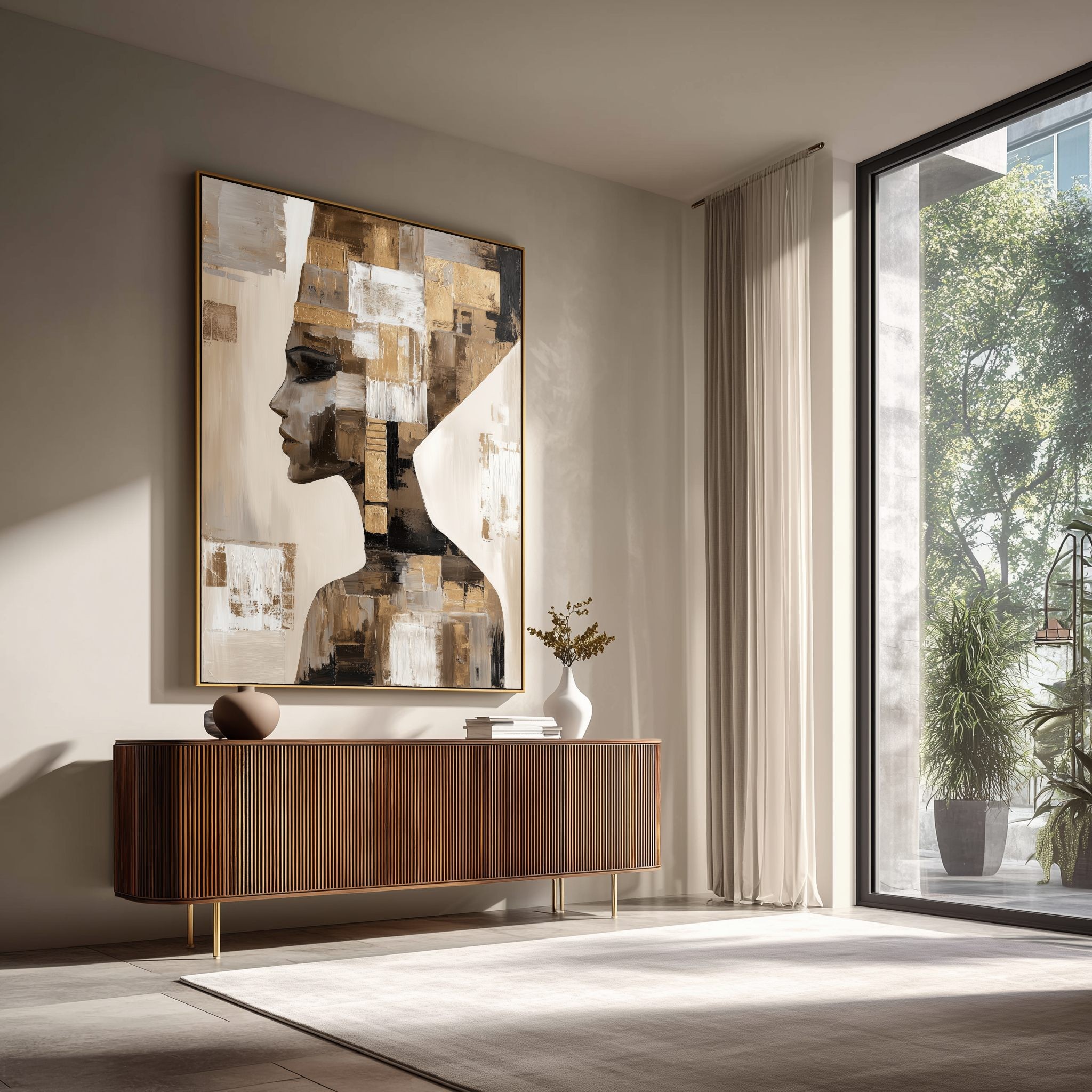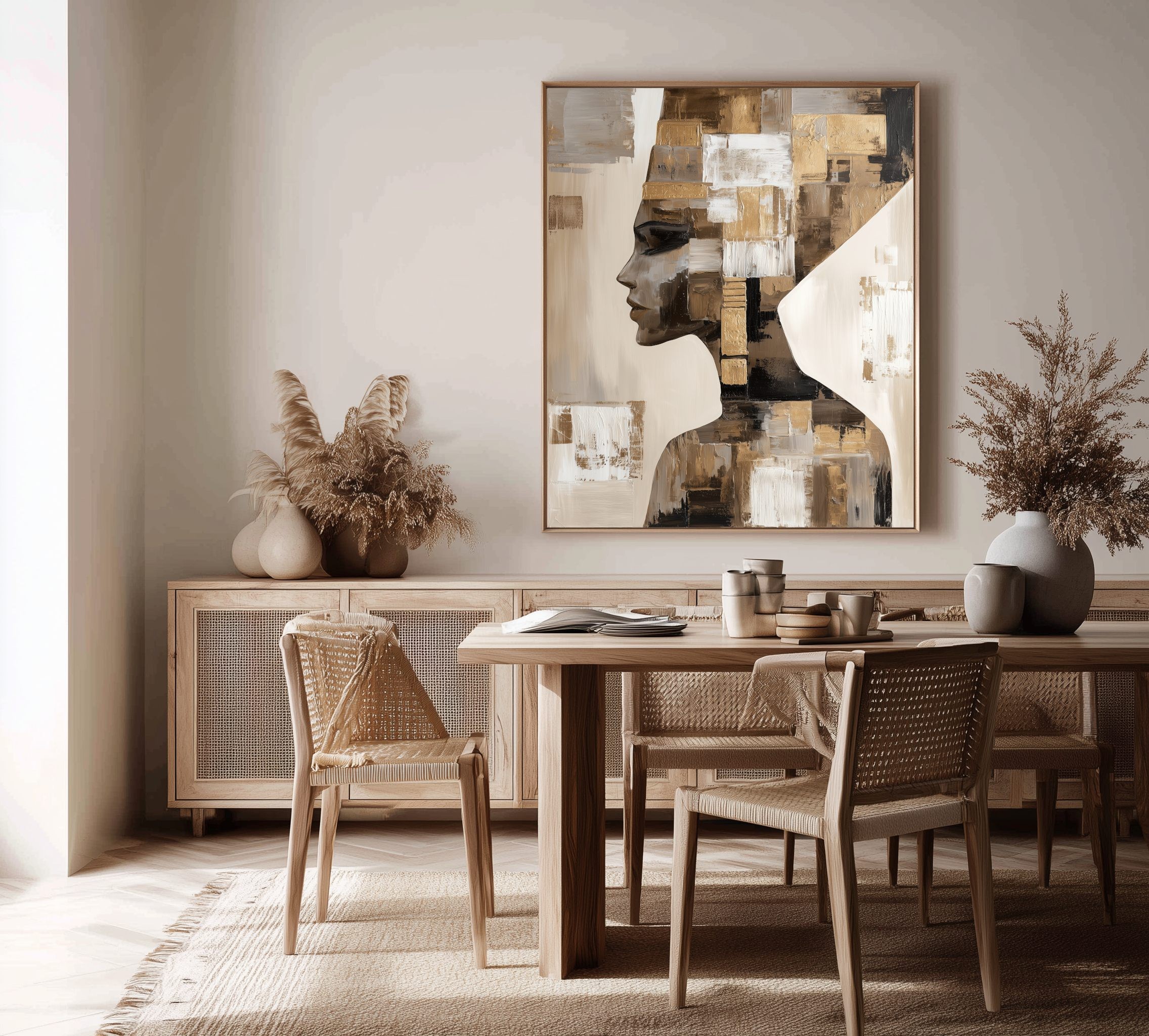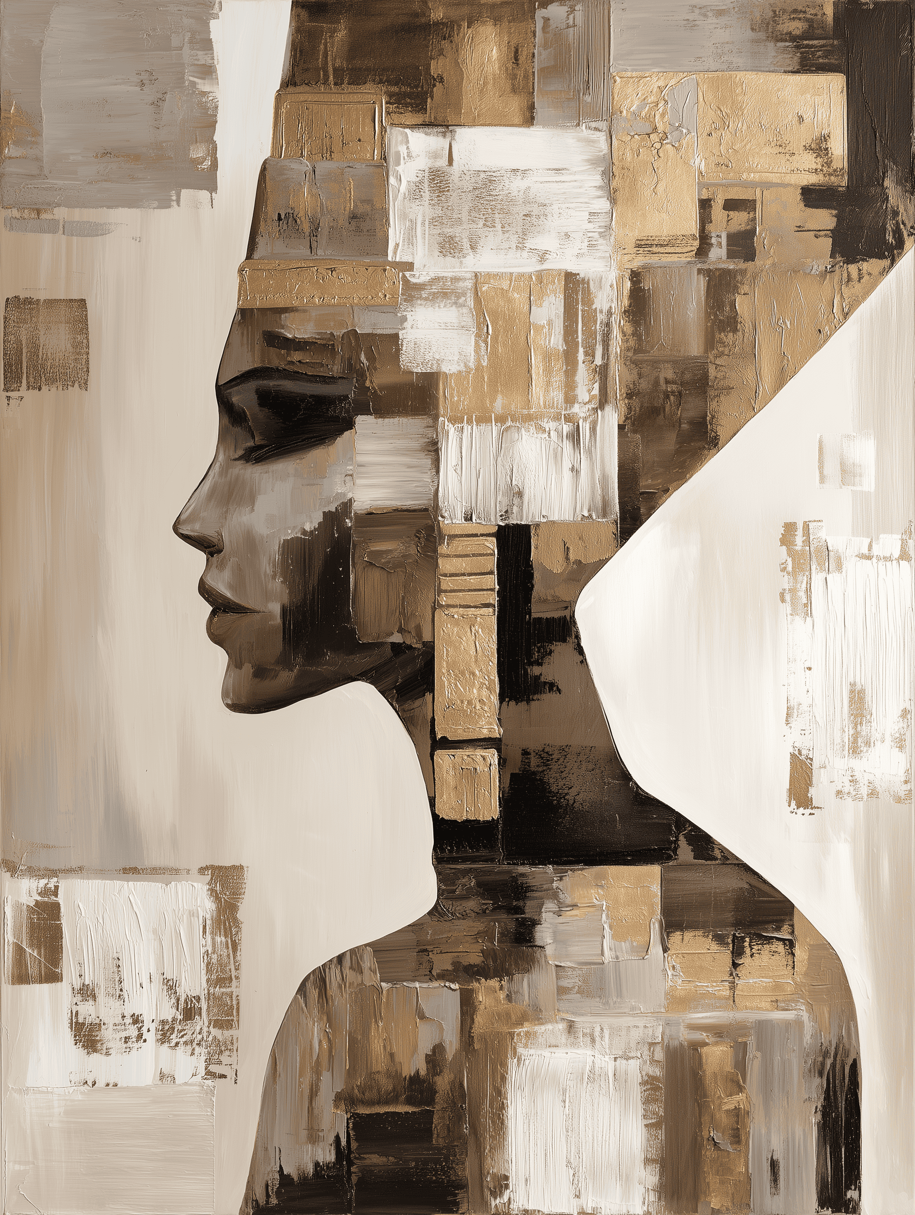 Este cuadro abstracto representa un rostro egipcio estilizado, fusionado con formas geométricas y texturas en tonos dorados, negros, beige y blancos. La composición evoca la grandeza del arte faraónico con un enfoque contemporáneo, creando una pieza elegante y poderosa. Ideal para quienes buscan una obra con carácter único, perfecta para decoración moderna en salones, oficinas o espacios sofisticados. Su combinación de colores metálicos y diseño abstracto aporta distinción y exclusividad, convirtiéndolo en un lienzo que conecta historia, simbolismo y arte contemporáneo.