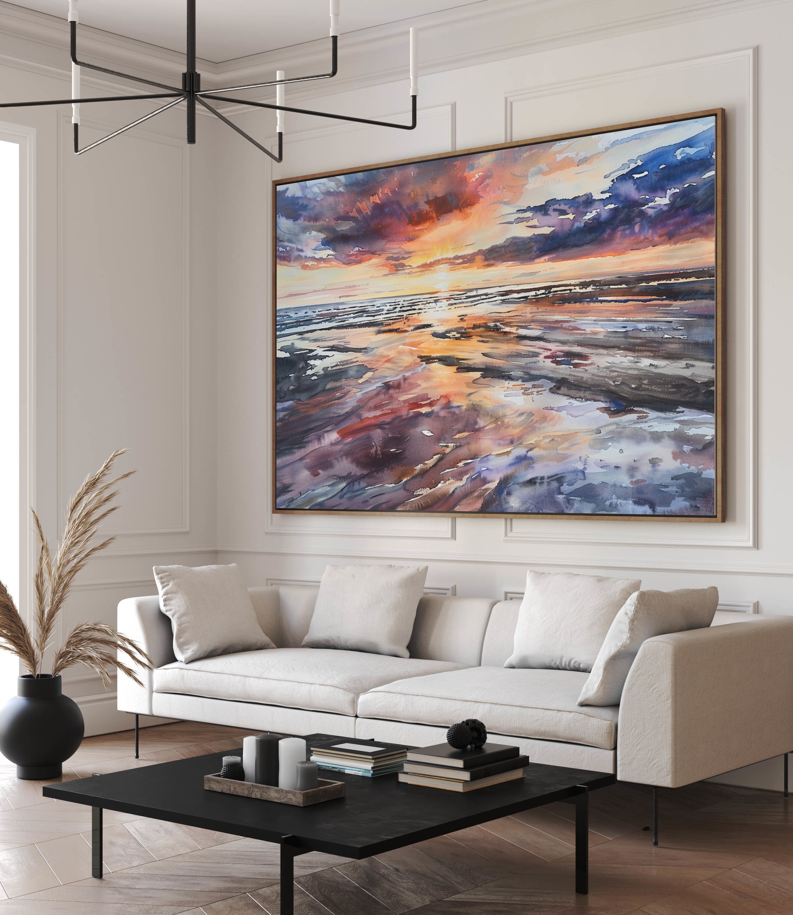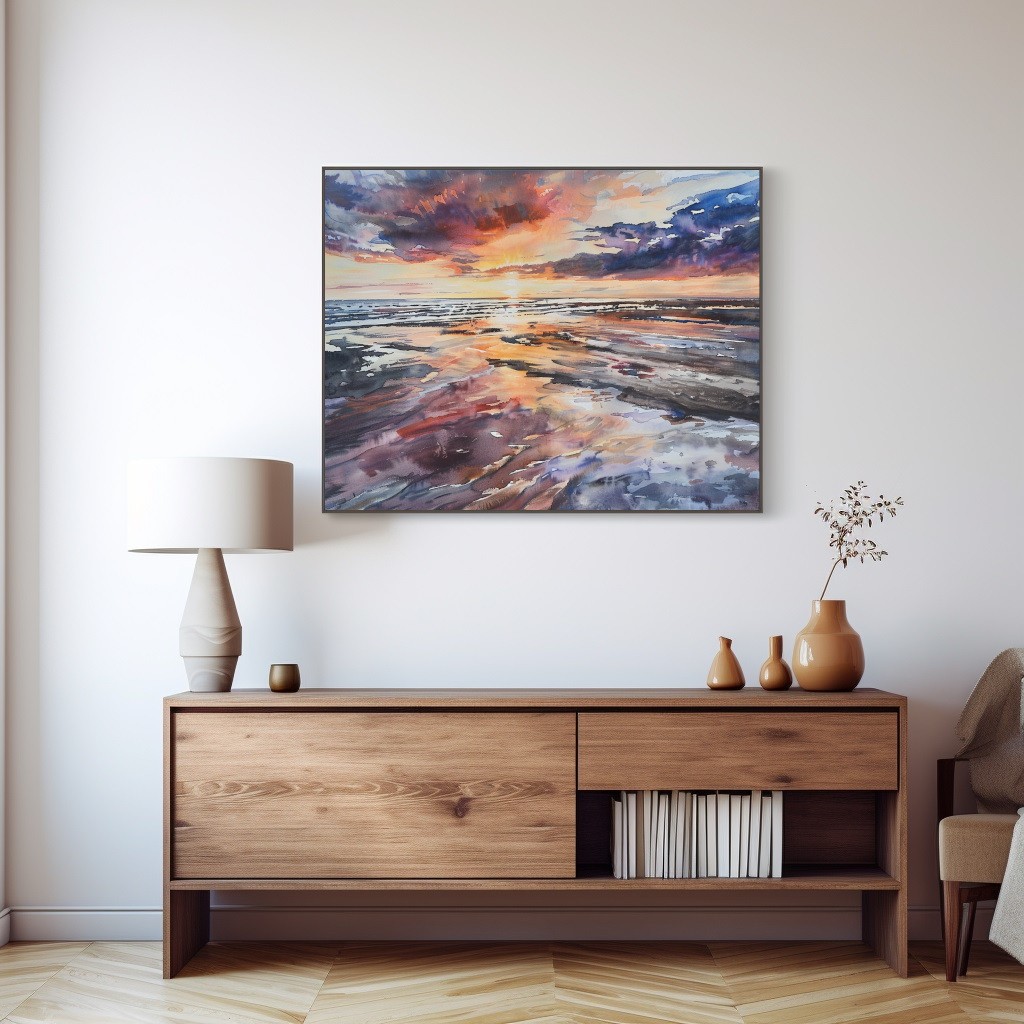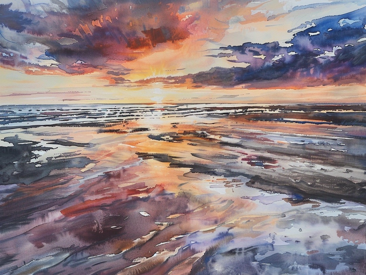 Esta acuarela capta la magia de un atardecer en la playa, con el sol hundiéndose en el horizonte y reflejándose en las aguas poco profundas. Los vibrantes tonos naranjas, púrpuras y azules se mezclan con las sombras oscuras de las nubes, creando una atmósfera dramática y envolvente. Perfecta para quienes buscan una escena de playa cálida y evocadora.