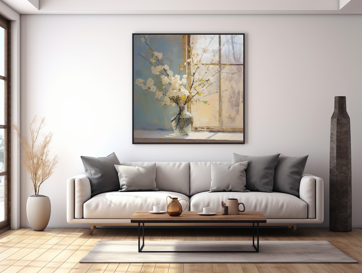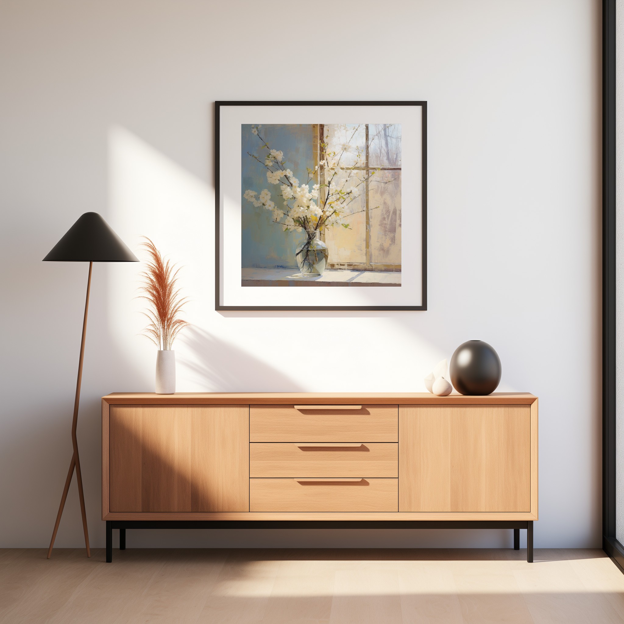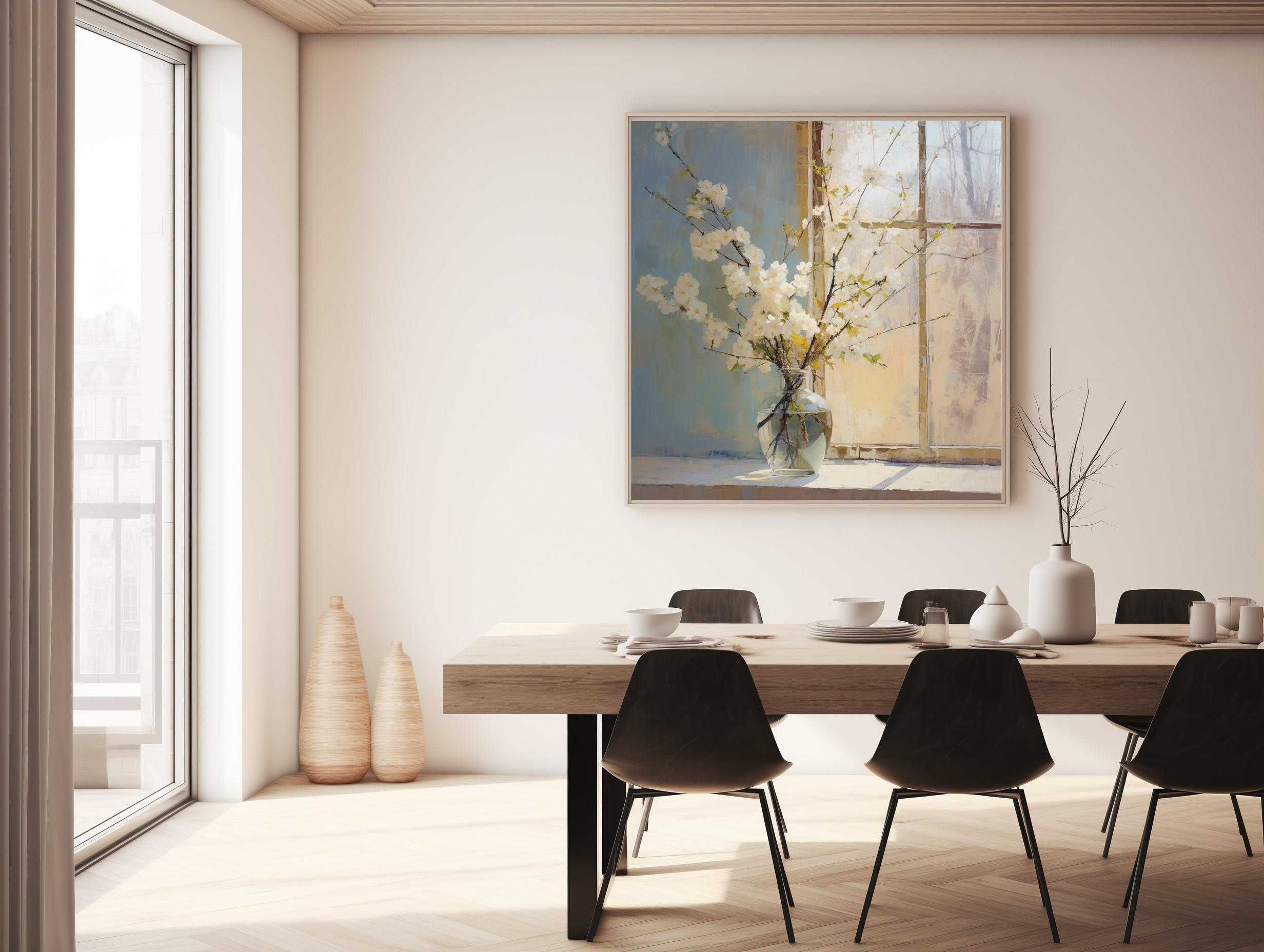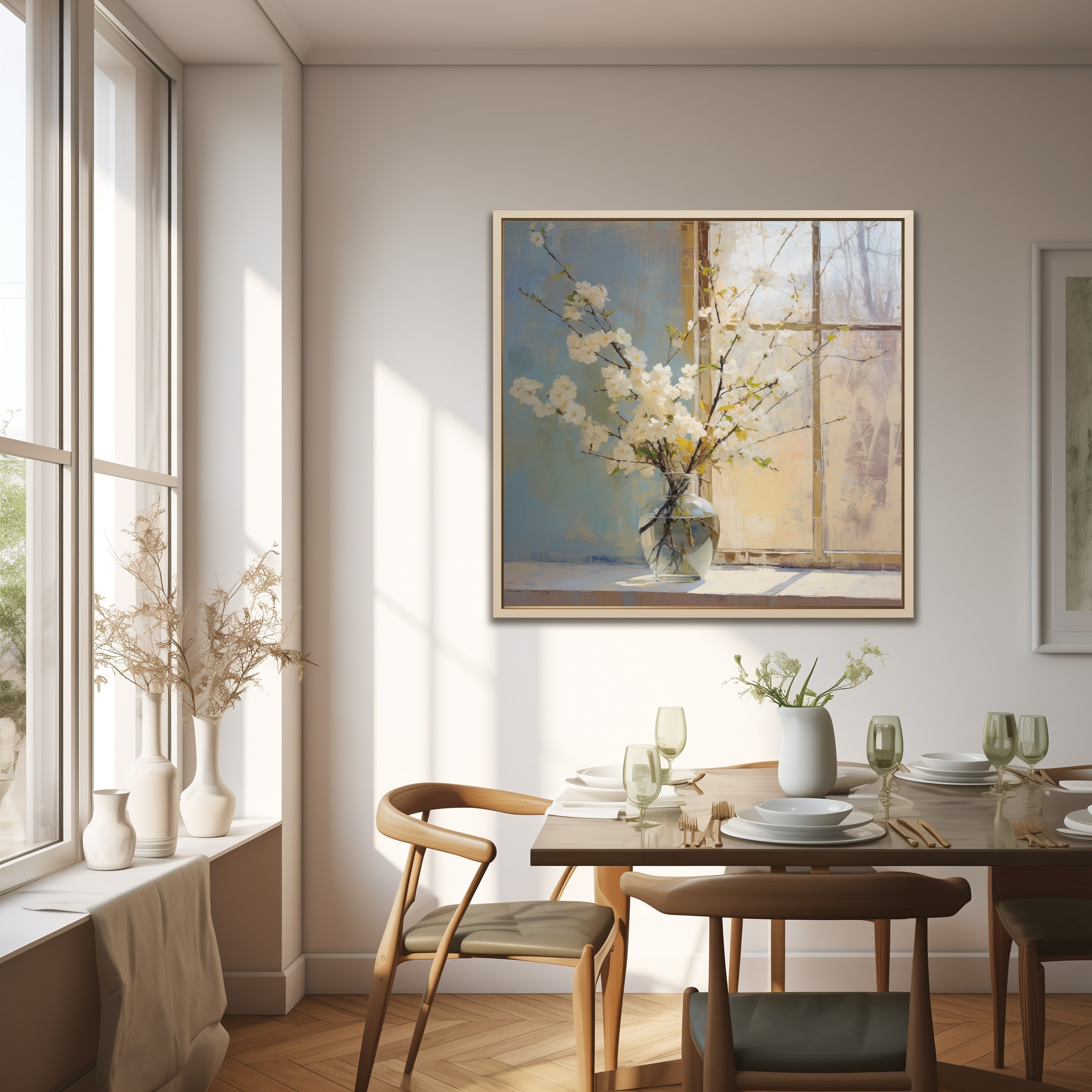 Precioso cuadro decorativo que muestra un jarrón de cristal con ramas floridas de flores blancas, situado sobre una mesa junto a una ventana. La luz suave y cálida entra a través de la ventana, iluminando las flores y creando un ambiente sereno y acogedor, con tonos suaves y una atmósfera primaveral.