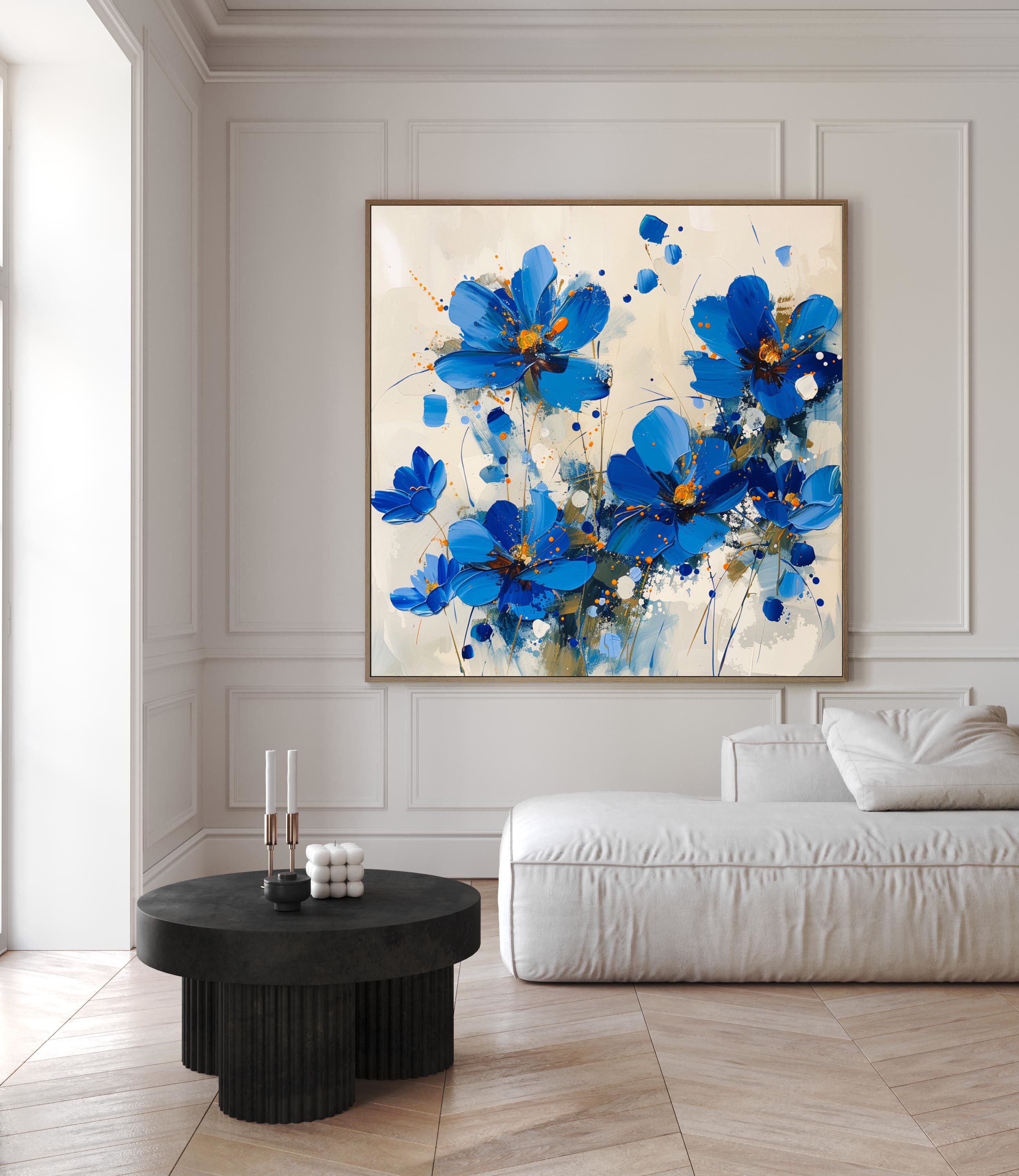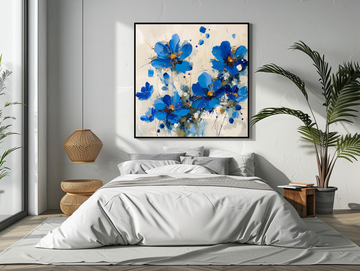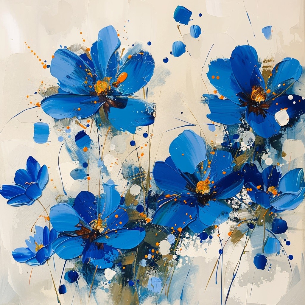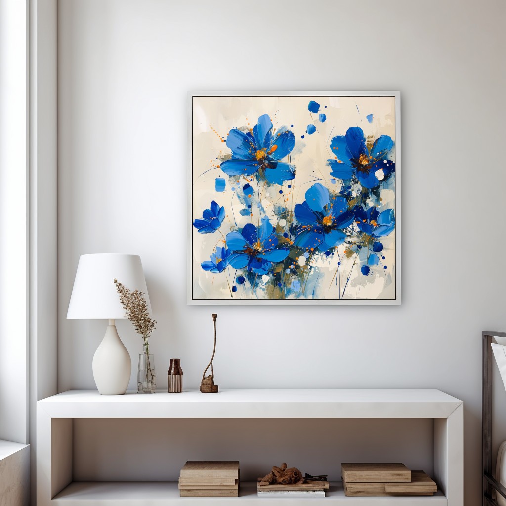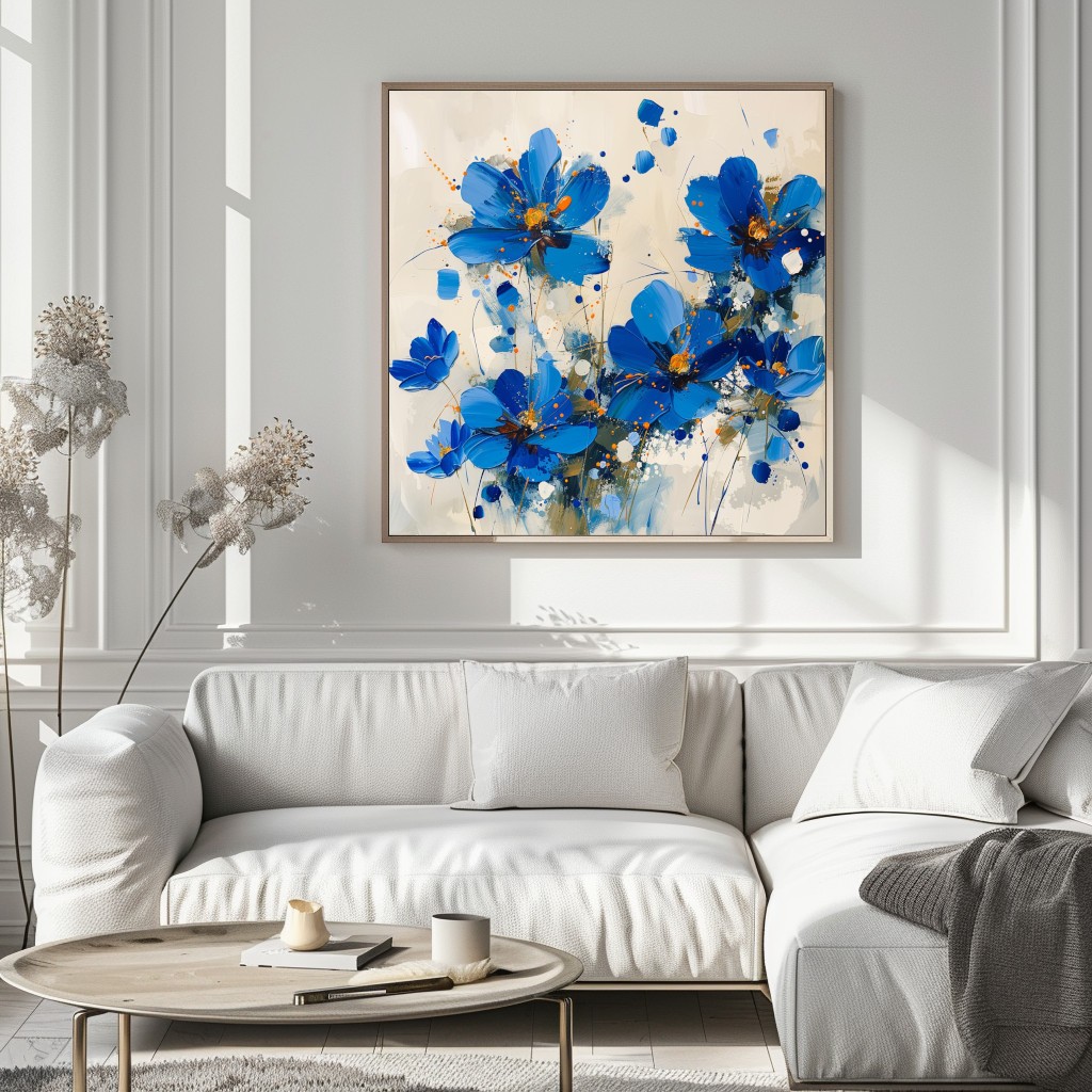 El cuadro decorativo Petal Symphony muestra flores abstractas de un vibrante color azul con toques de naranja. Los pétalos y tallos están pintados de manera expresiva con brochazos audaces y salpicaduras de pintura. El fondo es un tono neutro claro, que resalta aún más los colores brillantes de las flores. La composición transmite energía y dinamismo a través de su estilo moderno.