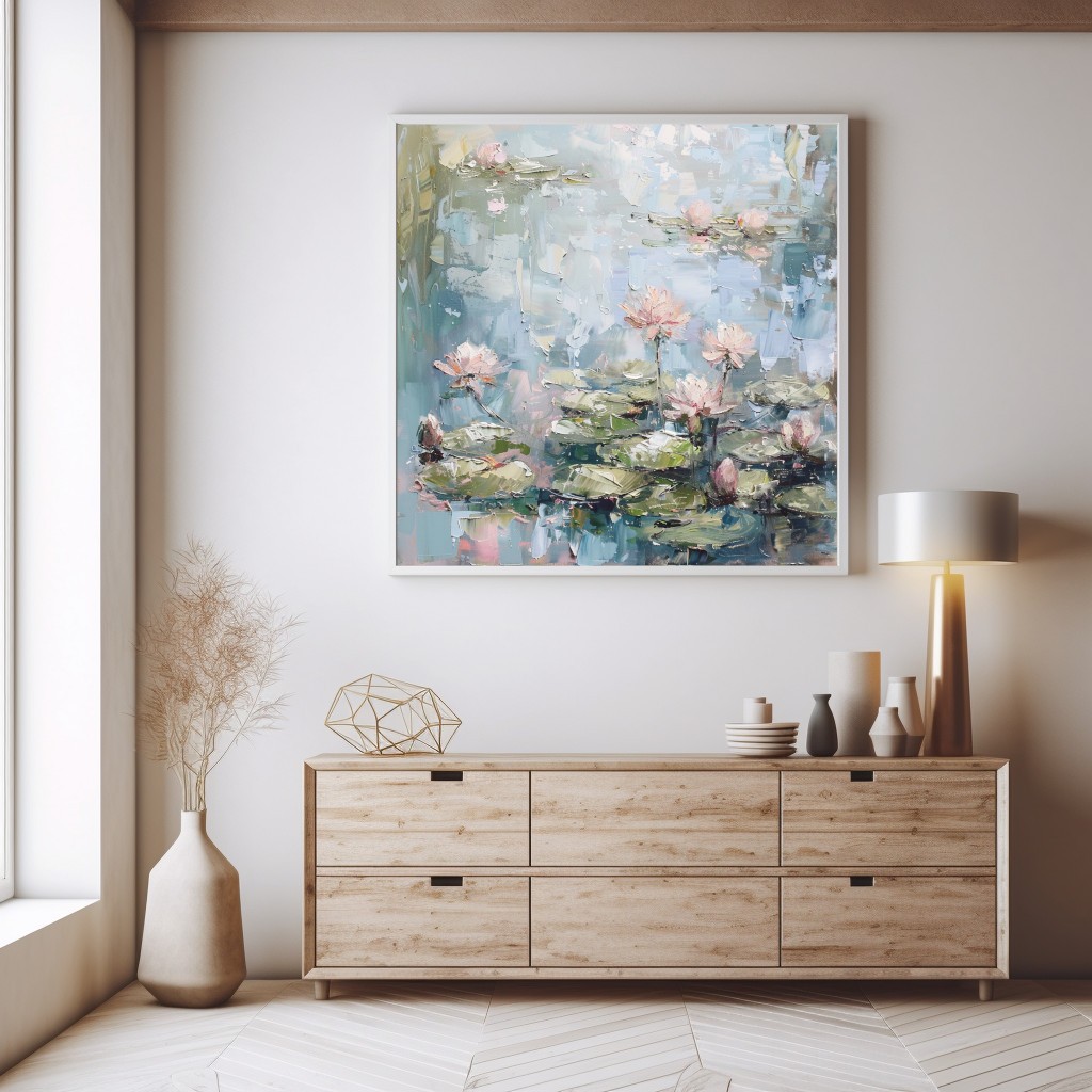 Este cautivador cuadro decorativo capta un estanque de lirios con flores en tonos rosados y hojas verdes, sobre un reflejo acuoso en matices azules y blancos. La técnica de pintura al óleo crea texturas ricas y movimientos fluidos, evocando la frescura y serenidad de la naturaleza. Ideal para ambientes que busquen transmitir paz y elegancia.