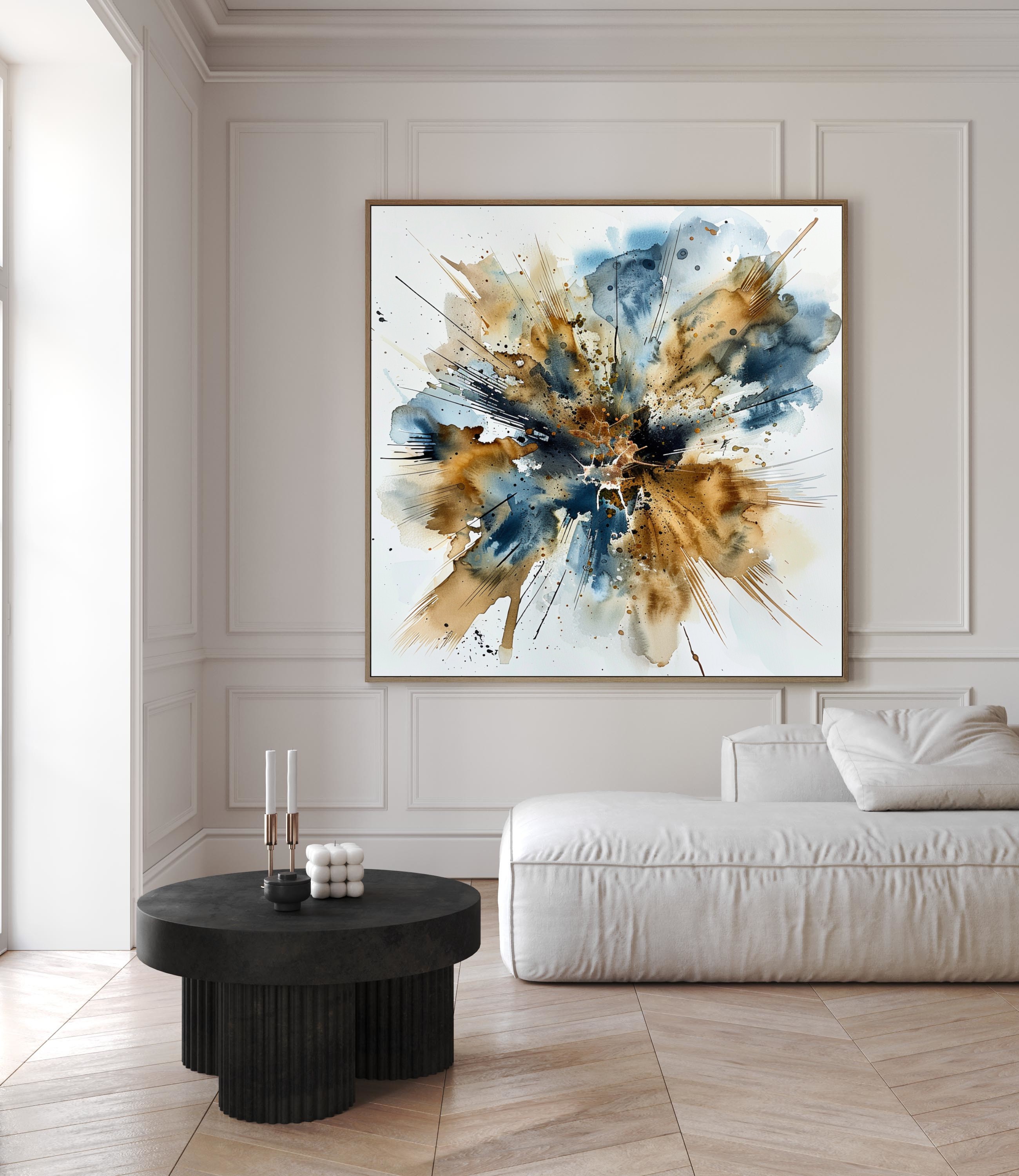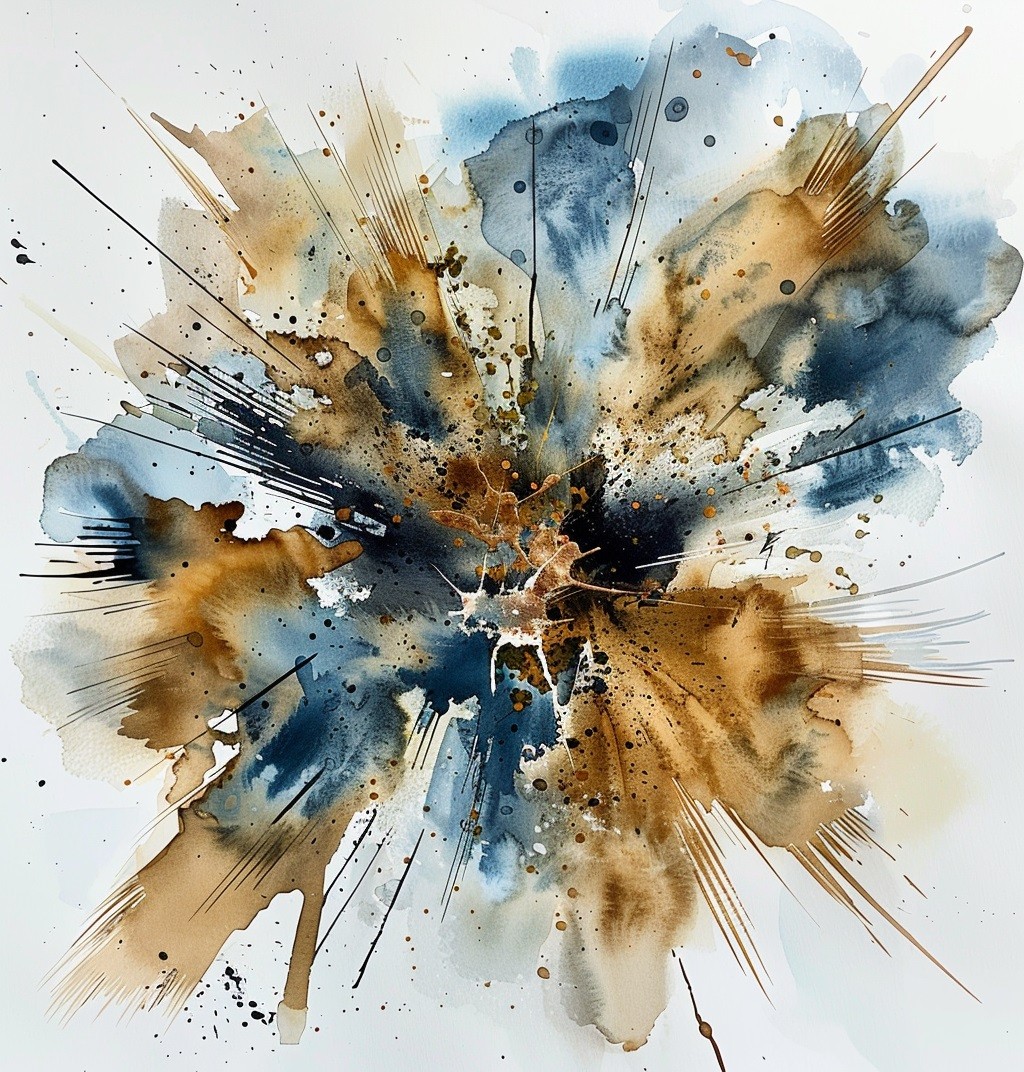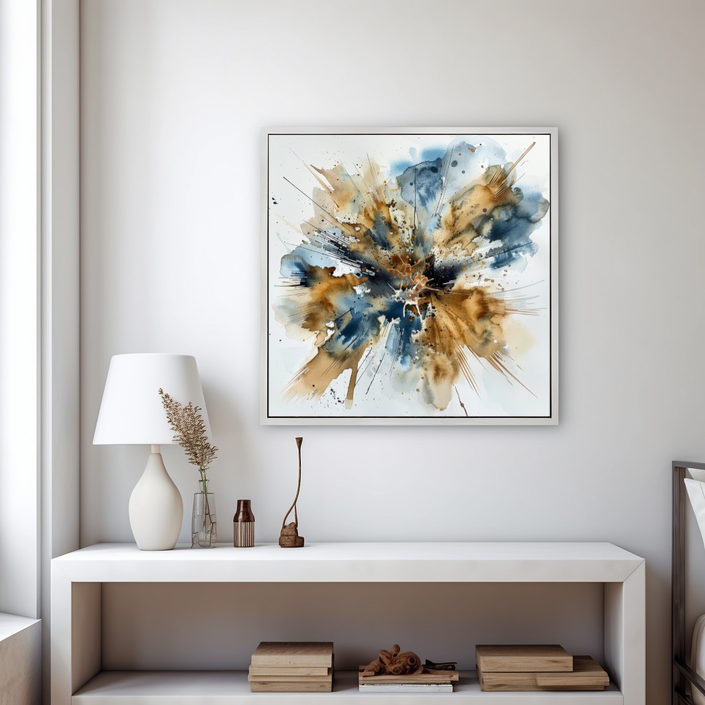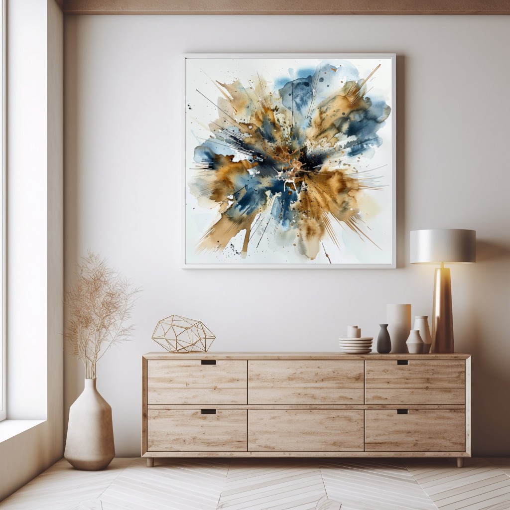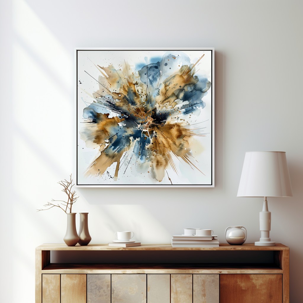 Este vibrante cuadro decorativo presenta una explosión abstracta de tintas en tonos de azul, marrón y dorado. Su diseño dinámico y las salpicaduras enérgicas capturan el movimiento y la intensidad, creando una pieza central audaz y llamativa. Perfecto para modernizar cualquier espacio y añadir un toque de arte contemporáneo y sofisticación. Ideal para ambientes creativos y modernos.