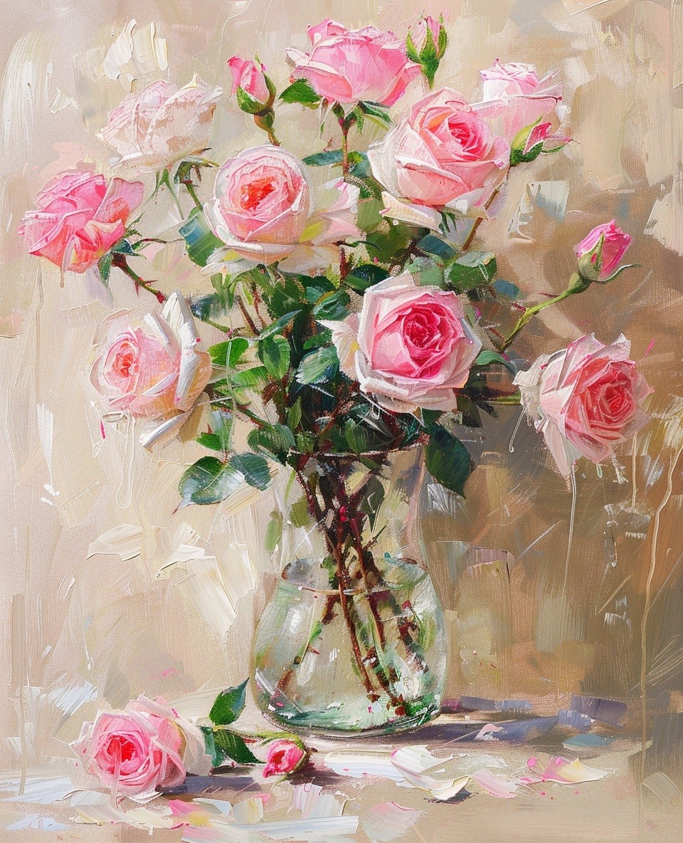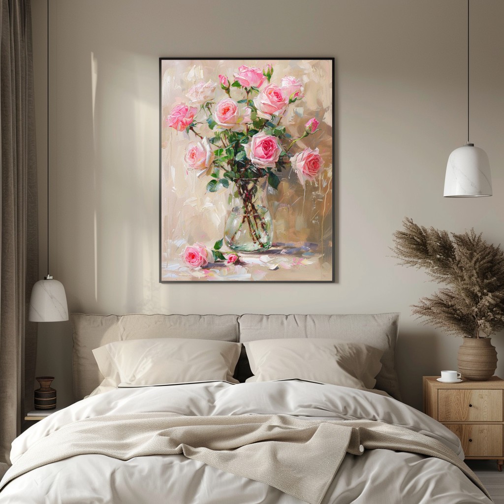 Este encantador cuadro captura la elegancia intemporal de un arreglo de rosas rosadas en un jarrón de cristal. Con una paleta de colores suaves y trazos de pintura texturizados, este lienzo transmite delicadeza y frescura. Perfecto para aportar un toque de romanticismo y belleza a cualquier espacio, ideal para salones, dormitorios o recibidores.