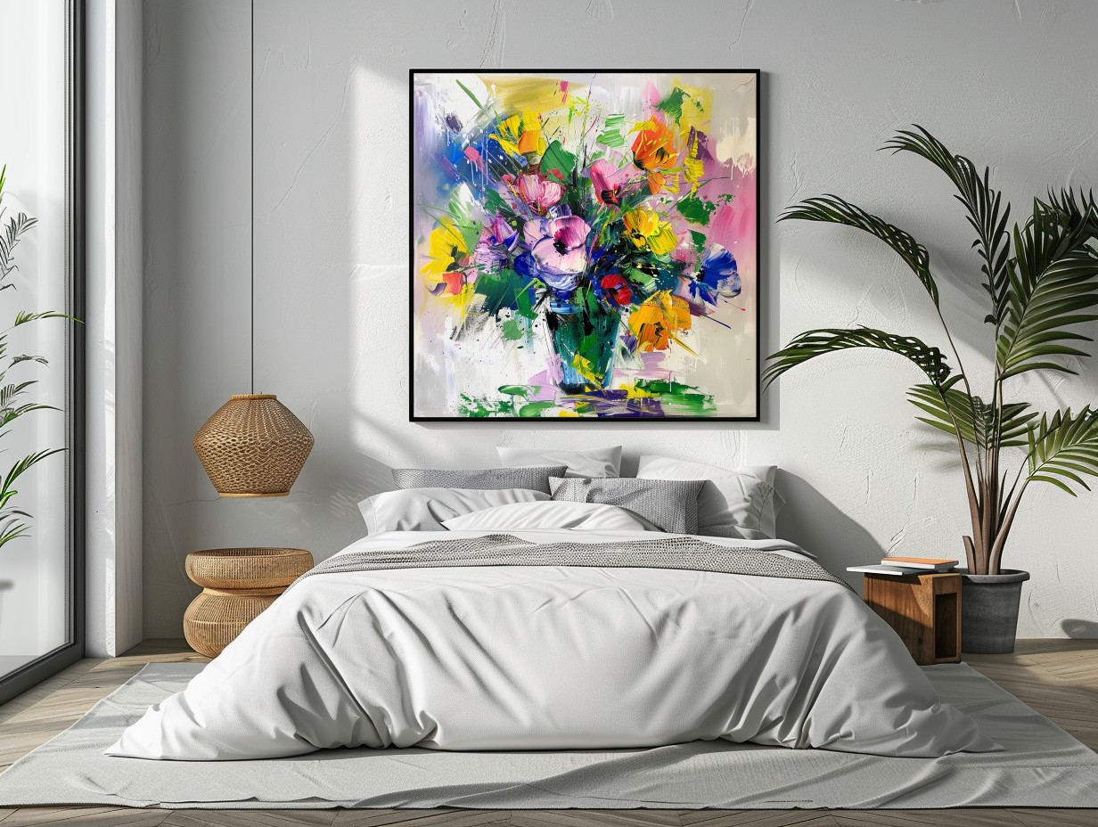 Este cuadro explosivo y colorido presenta un vibrante arreglo de flores abstractas. Con trazos enérgicos y una paleta de colores brillantes que incluyen rosa, amarillo, azul y verde, esta obra irradia alegría y dinamismo. Es perfecto para añadir un toque de frescura y modernidad a cualquier espacio, haciendo que cada rincón cobre vida. Ideal para ambientes contemporáneos.